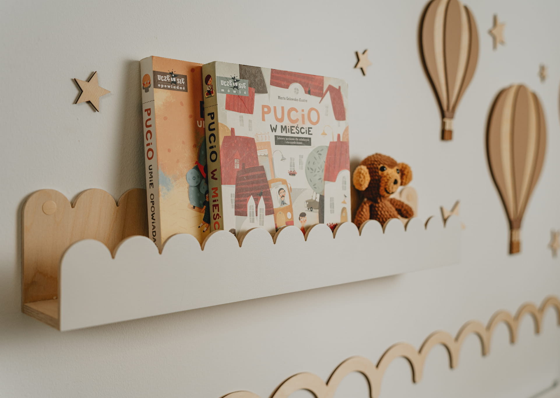 Įkvėpta pasakų švelnumo, – tai medinė lentyna, kuri subtiliai įsilieja į vaiko kambario interjerą. Jos banguotas priekinis kraštas suteikia jaukumo ir žaismingumo, o natūrali fanera – šilumos ir ilgaamžiškumo.