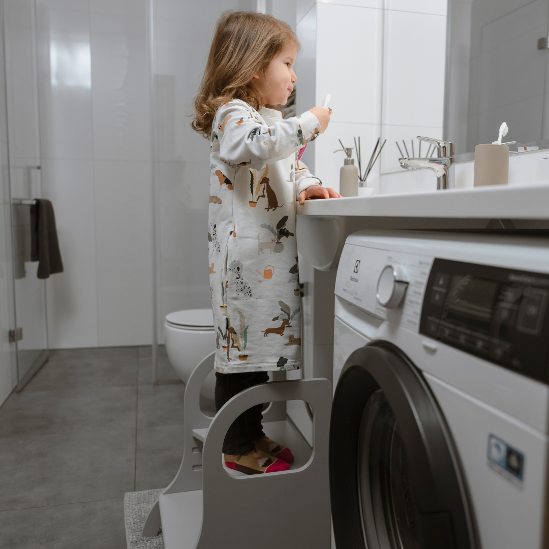 Saugus, stabilus ir pritaikytas mažylių savarankiškumui ugdyti – nuo pirmųjų bandymų siekti kriauklės iki tualeto naudojimo.