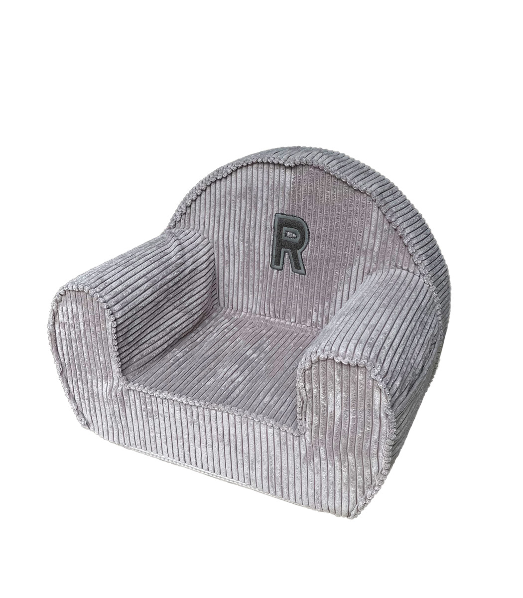 Vaikiškas velveto fotelis su pasirinkta raide – pilkai purpurinė
