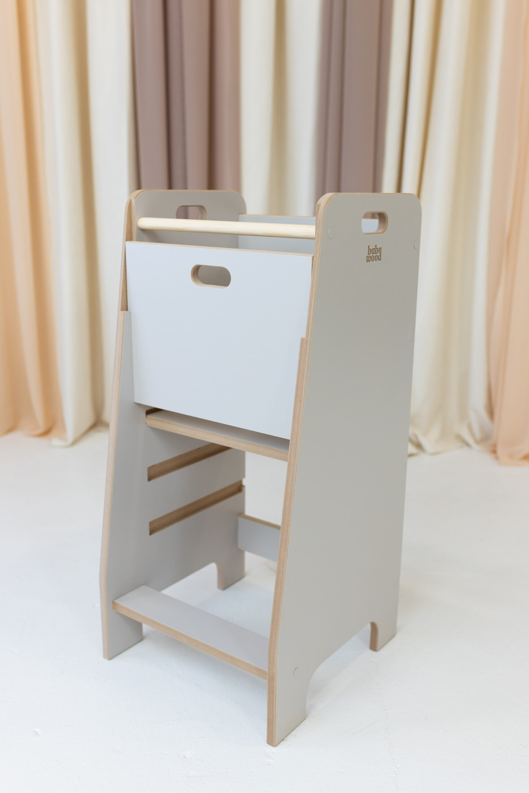 Kitchen Helper „auga“ kartu su vaiku – platformą galima lengvai pakelti arba nuleisti pagal vaiko ūgį. Taip jūsų mažylis visada stovės tinkamame aukštyje, kad saugiai padėtų ruošti maistą.
