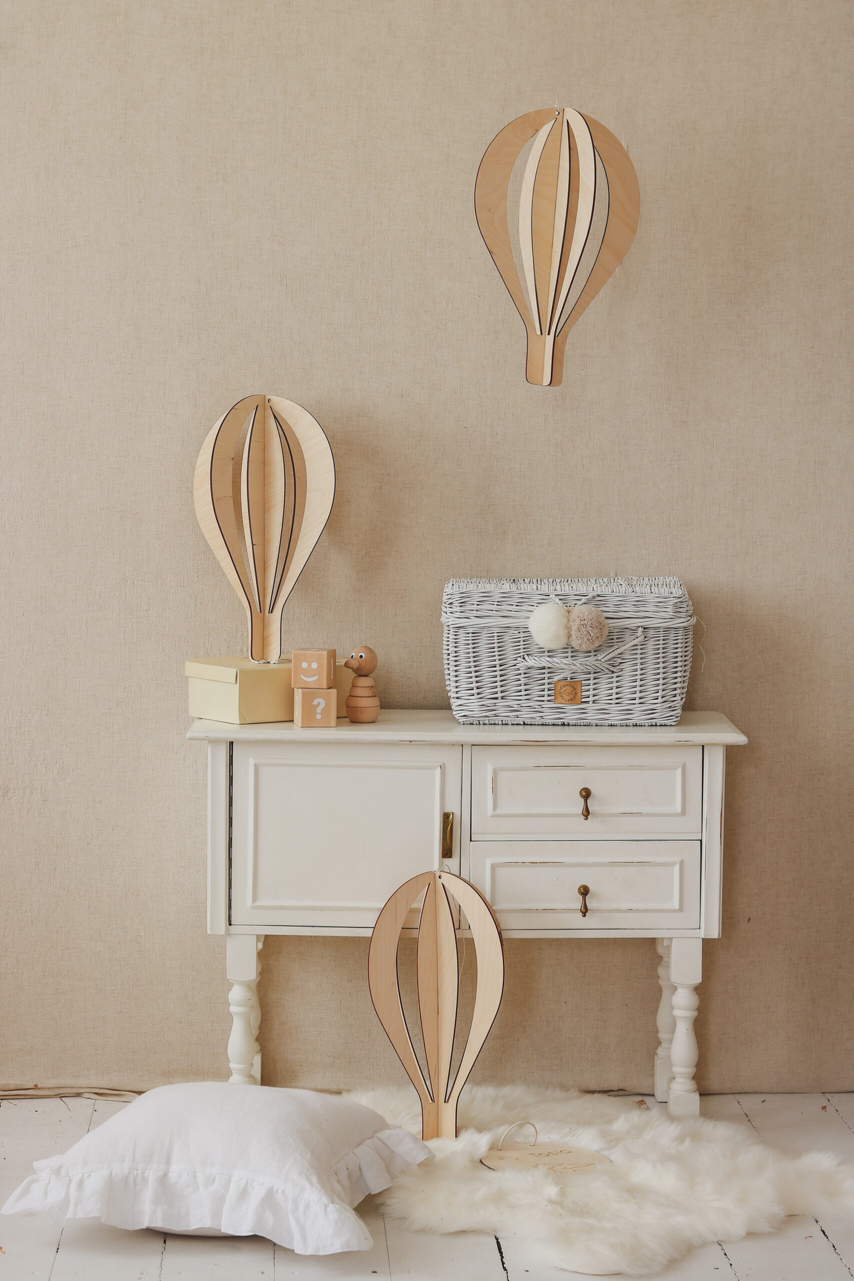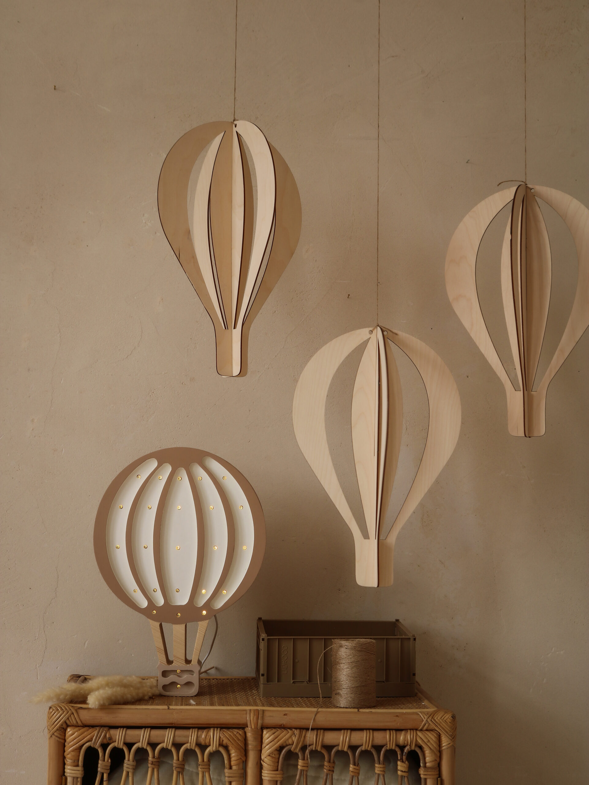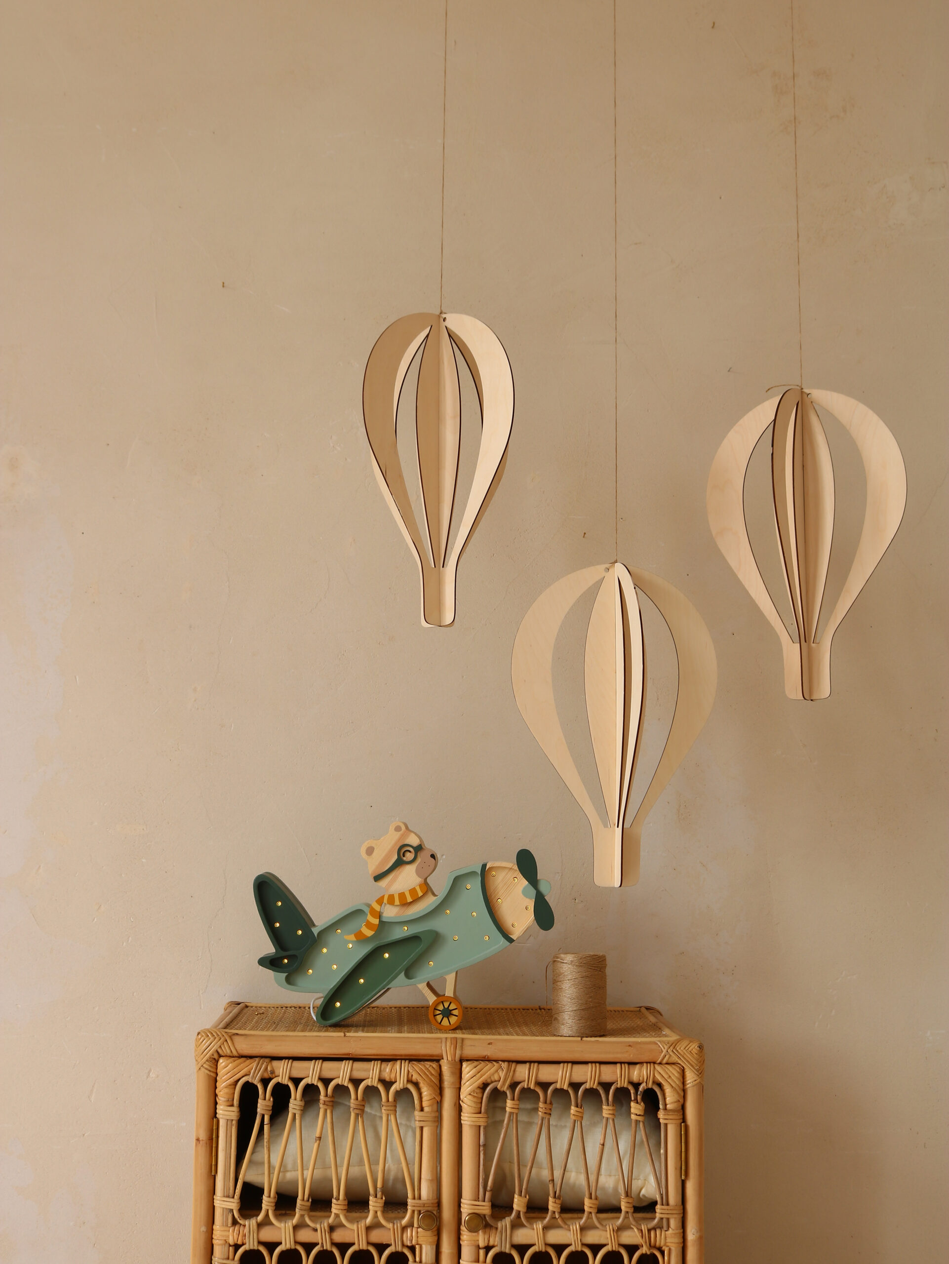 Sukurkite jaukią ir svajingą atmosferą su trijų medinių karšto oro balionų rinkiniu – lyg pakilę į dangų, jie žaismingai plūduriuos kambario ore.
