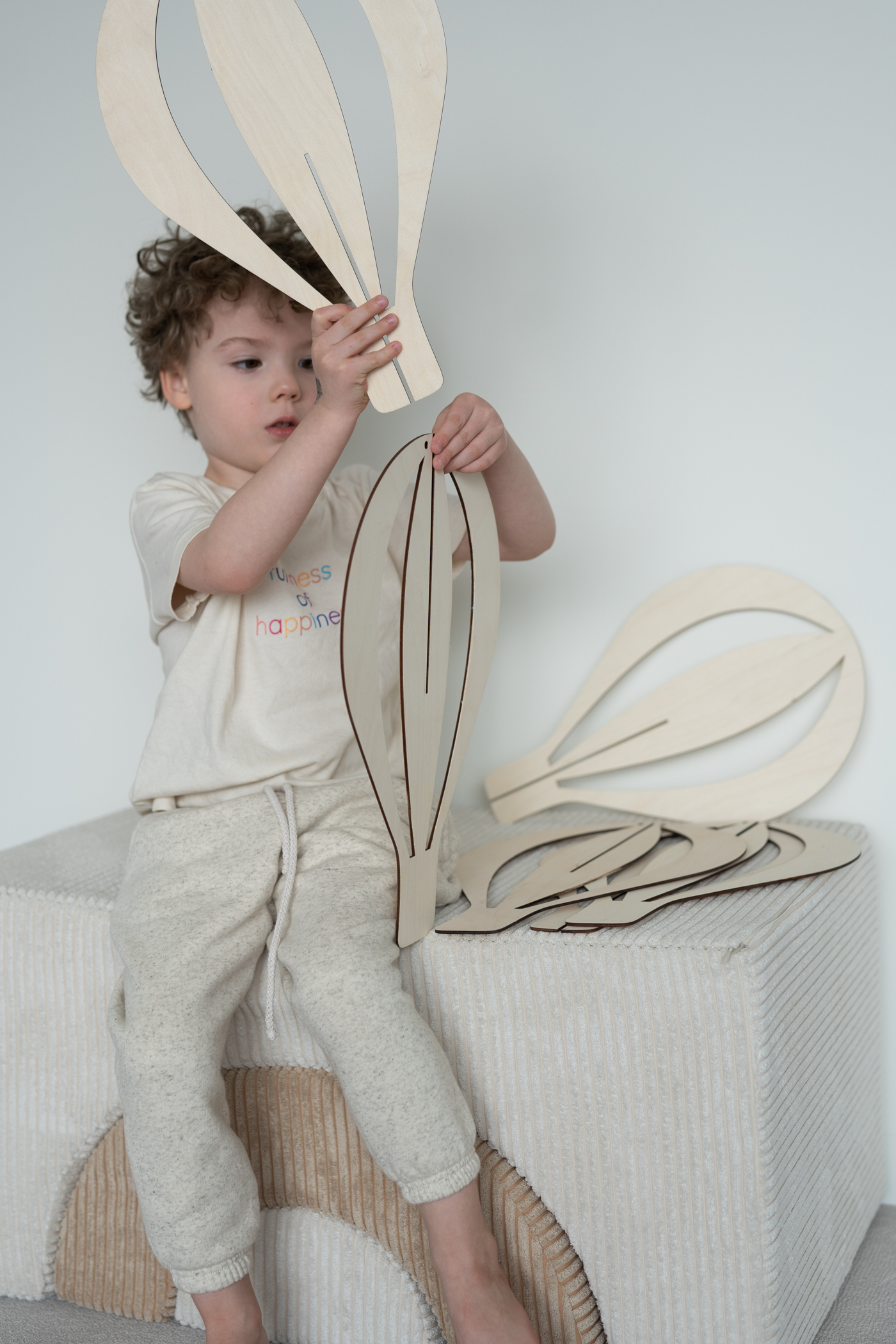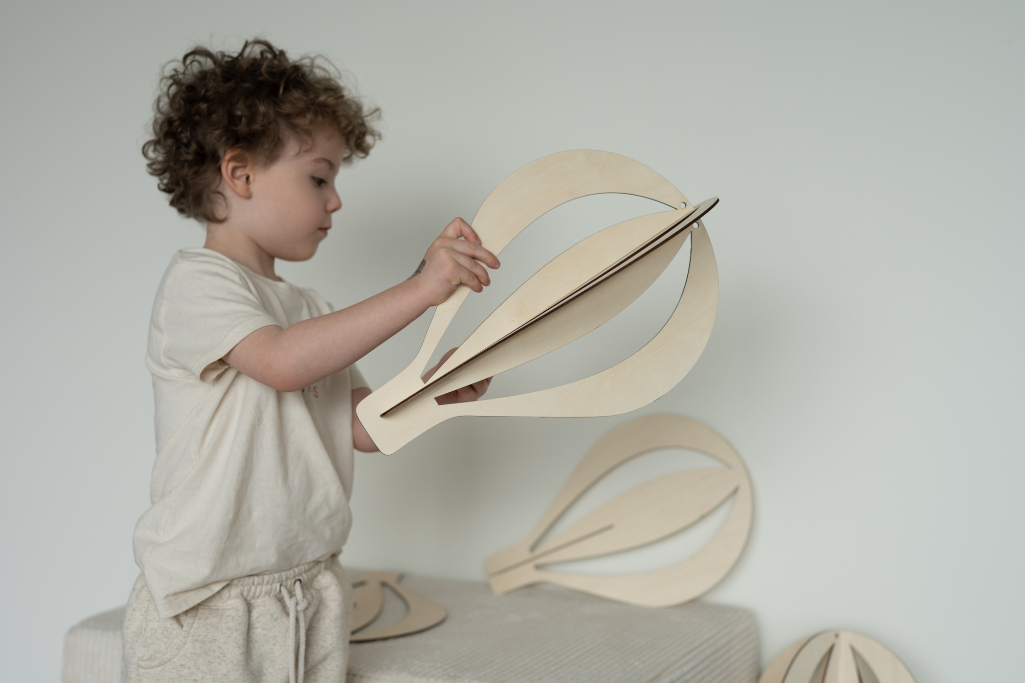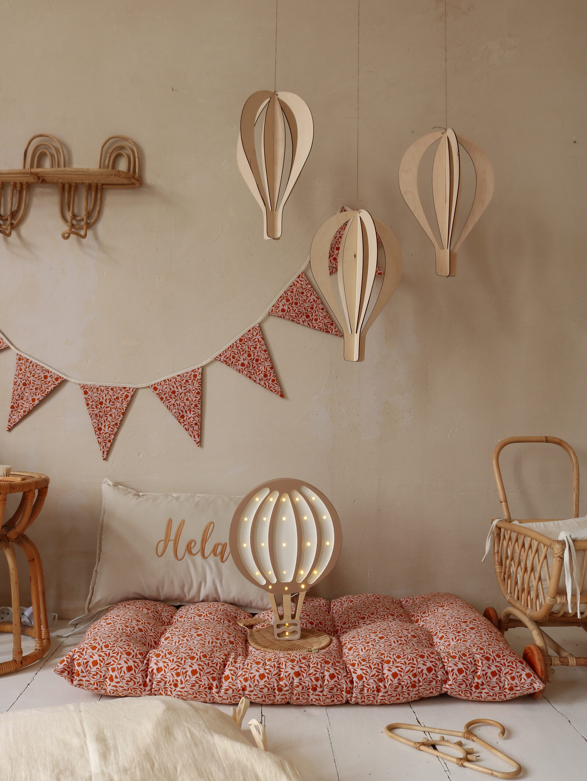 Sukurkite jaukią ir svajingą atmosferą su trijų medinių karšto oro balionų rinkiniu – lyg pakilę į dangų, jie žaismingai plūduriuos kambario ore.