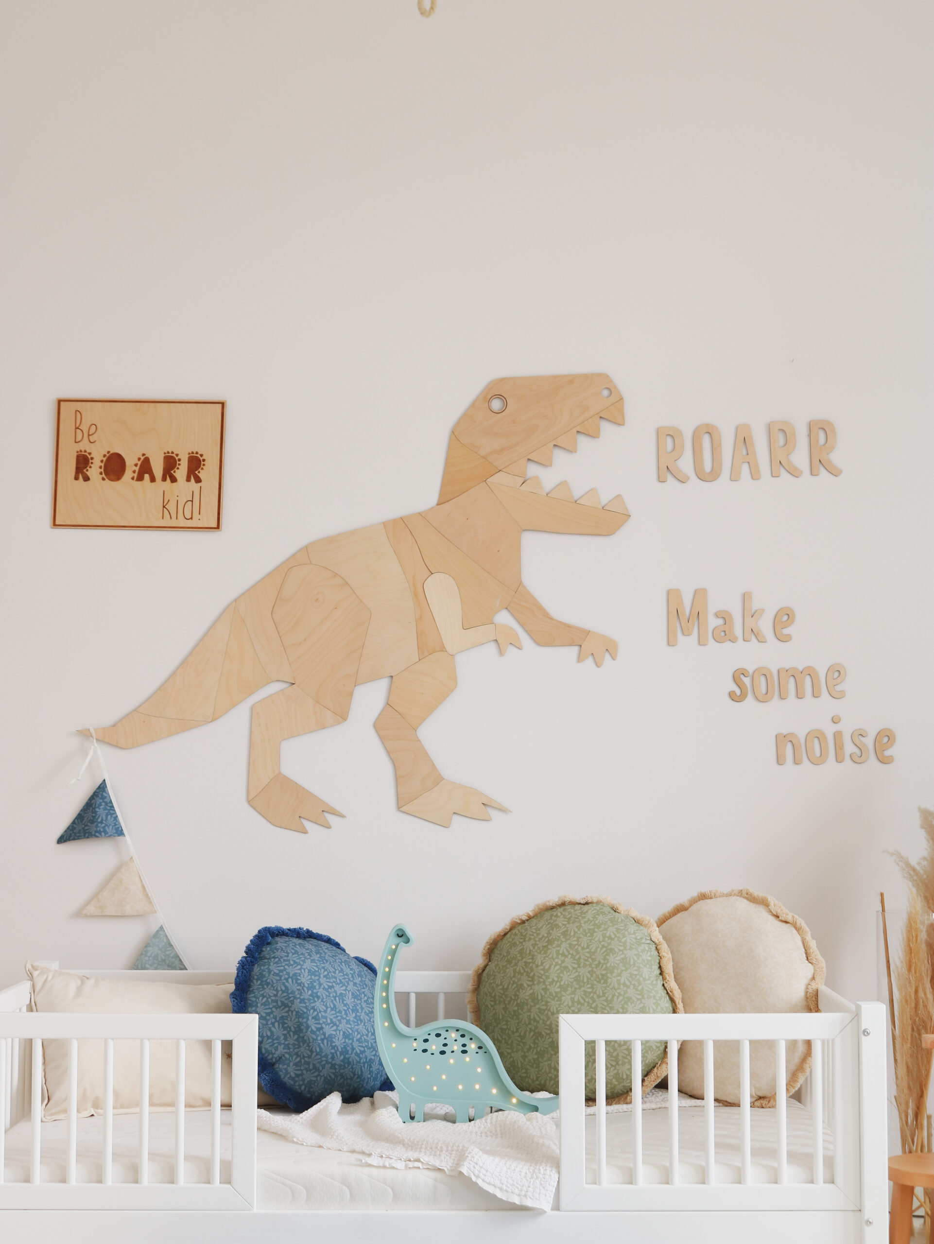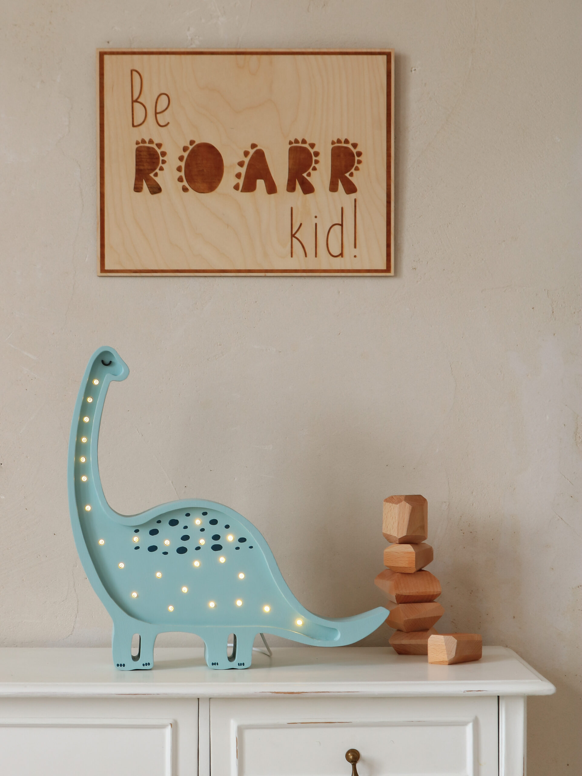 – Įkvepiantis užrašas „Be Roarr Kid“ – mažyliui, kuris nebijo svajoti ir tyrinėti