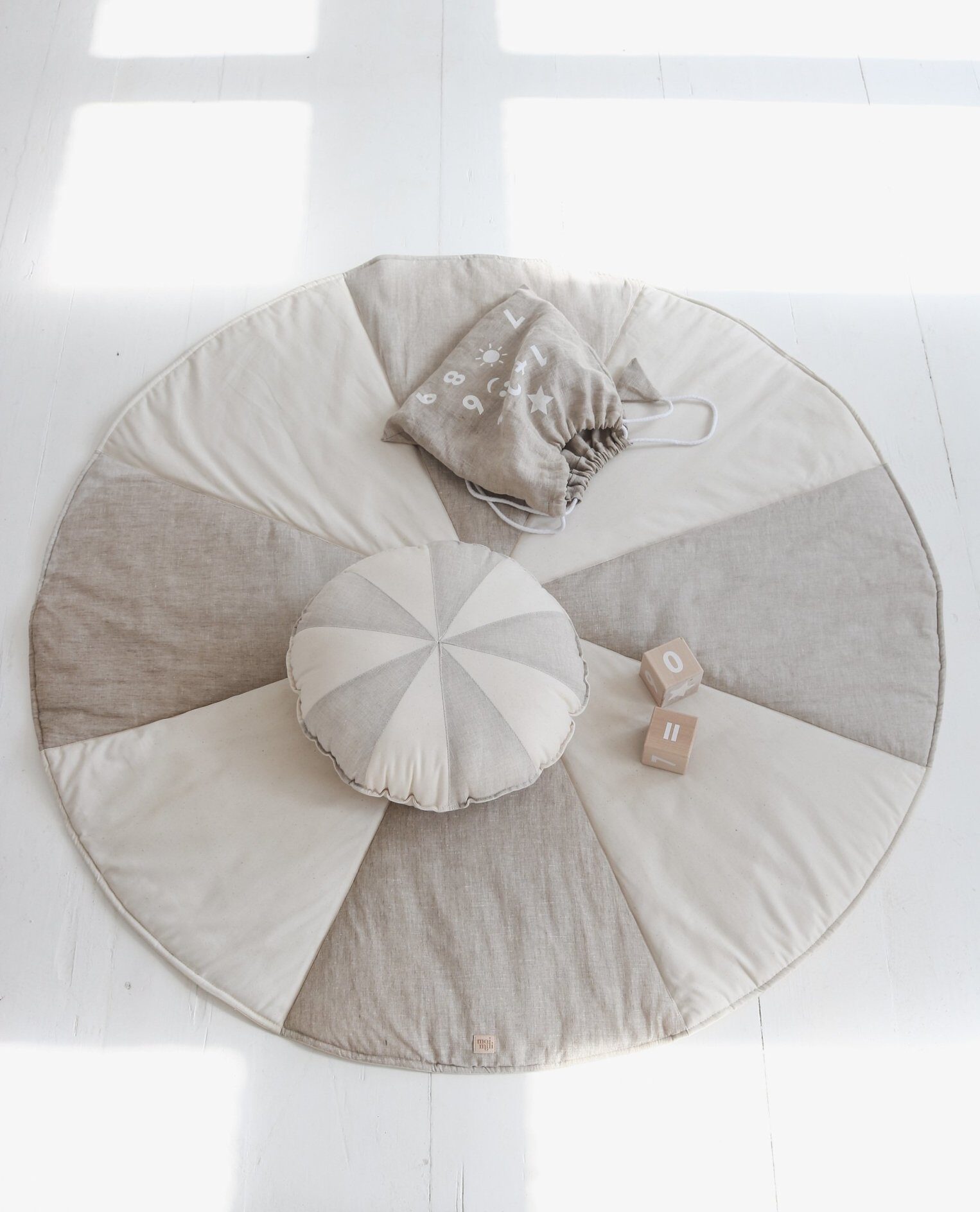 „Moi Mili” kilimėlis „Cream Candy“ – cirko estetikos įkvėptas aksesuaras, siūtas iš smėlio spalvos lino gabalėlių ir storos natūralios medvilnės. Subtilios spalvos puikiai dera vyresnio vaiko žaidimų kambaryje ar miegamajame. Tinka tipiuose, po baldakimu, kaip sienų dekoras ar tiesiog jauki vieta žaidimams bei poilsiui. 🙂