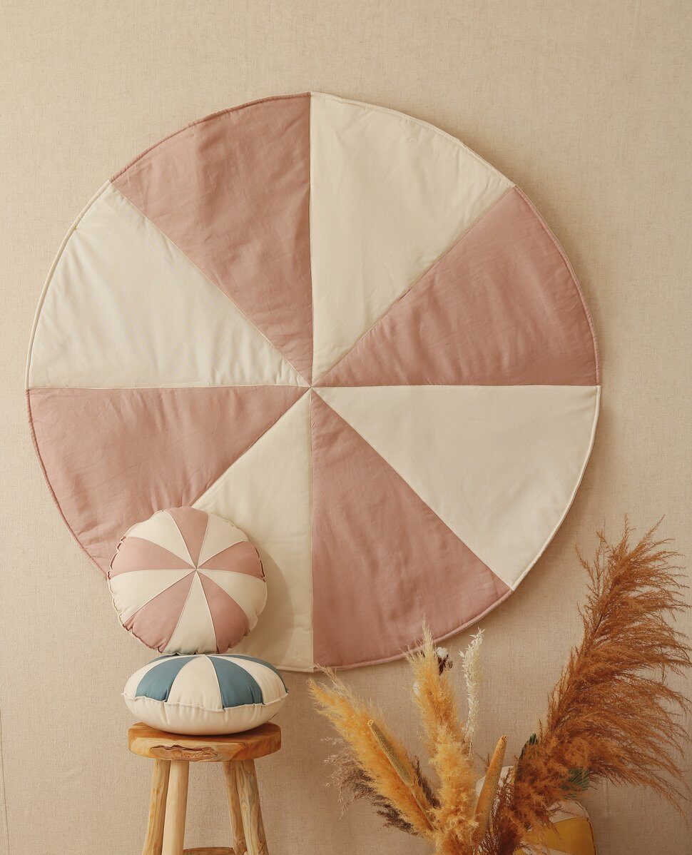 „Moi Mili” kilimėlis „Powder Candy“ – cirko estetikos įkvėptas aksesuaras, siūtas iš šviesiai rausvos spalvos lino gabalėlių ir storos natūralios medvilnės. Subtilios spalvos puikiai dera vyresnio vaiko žaidimų kambaryje ar miegamajame. Tinka tipiuose, po baldakimu, kaip sienų dekoras ar tiesiog jauki vieta žaidimams bei poilsiui. 🙂