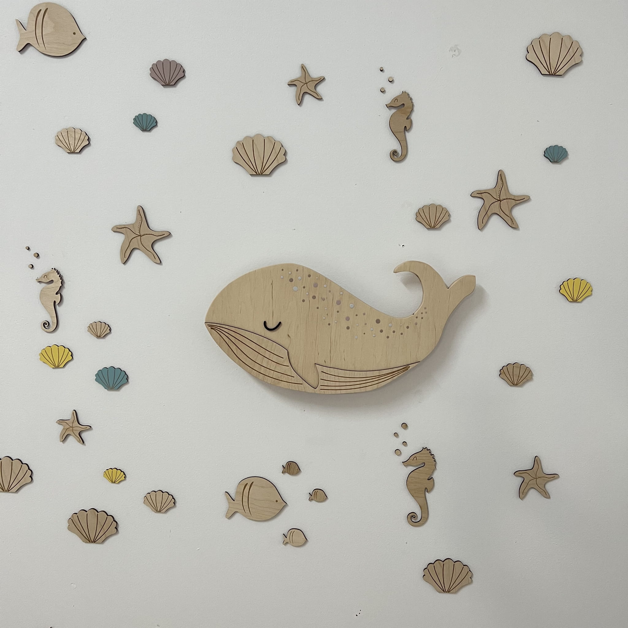 Kiekvienas taškelis ant banginio – tapytas rankomis trijų atspalvių dažais. Tai suteikia lempai unikalumo – nėra dviejų vienodų šviestuvų. Tarsi burbulai iš jūros gelmių – švelnūs, žaismingi ir kviečiantys svajoti.
