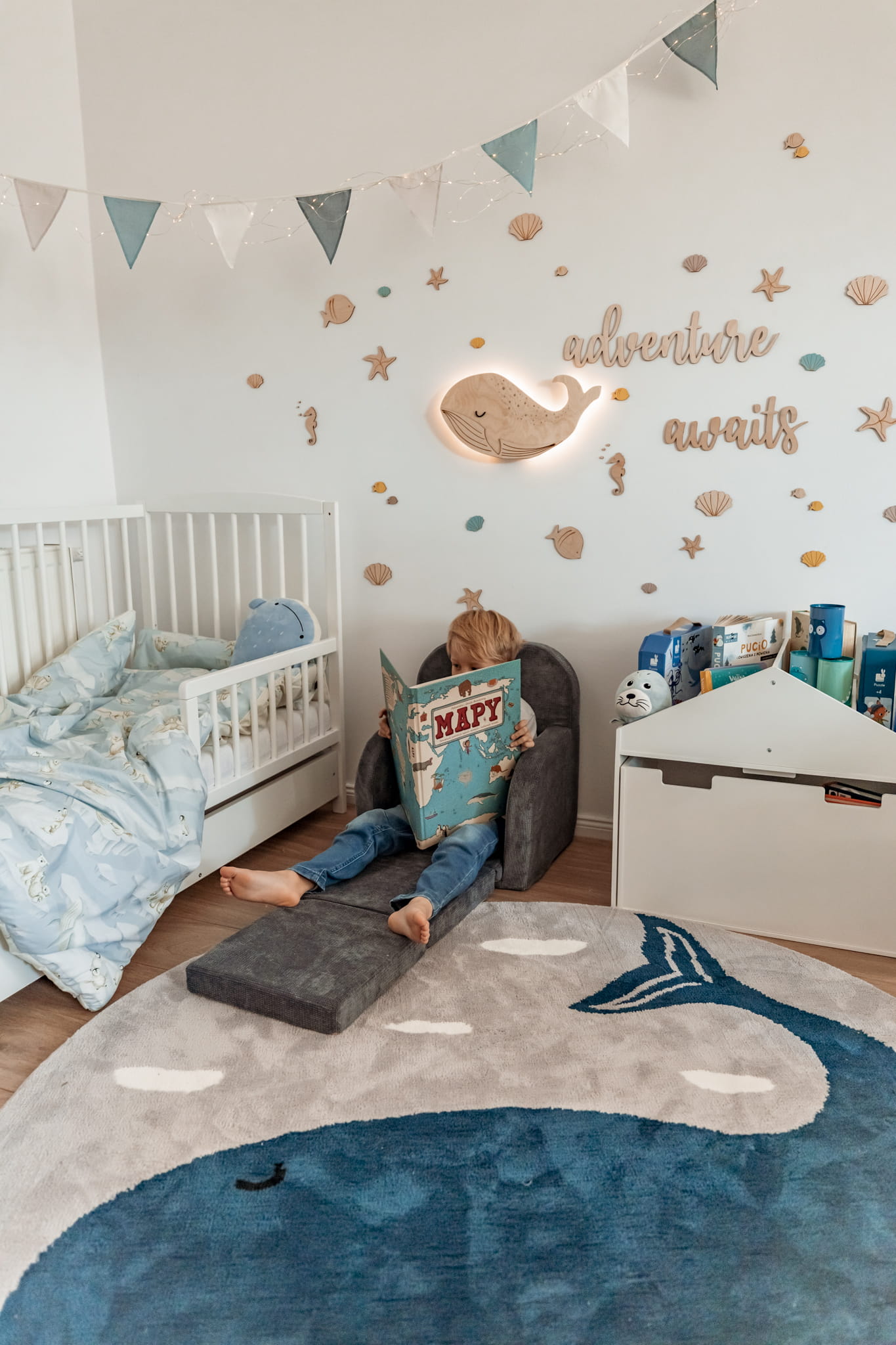 Pakvieskite šį švelnų banginį į savo mažylio pasaulį – tegul vakarai tampa jaukūs kaip jūros lopšinė.