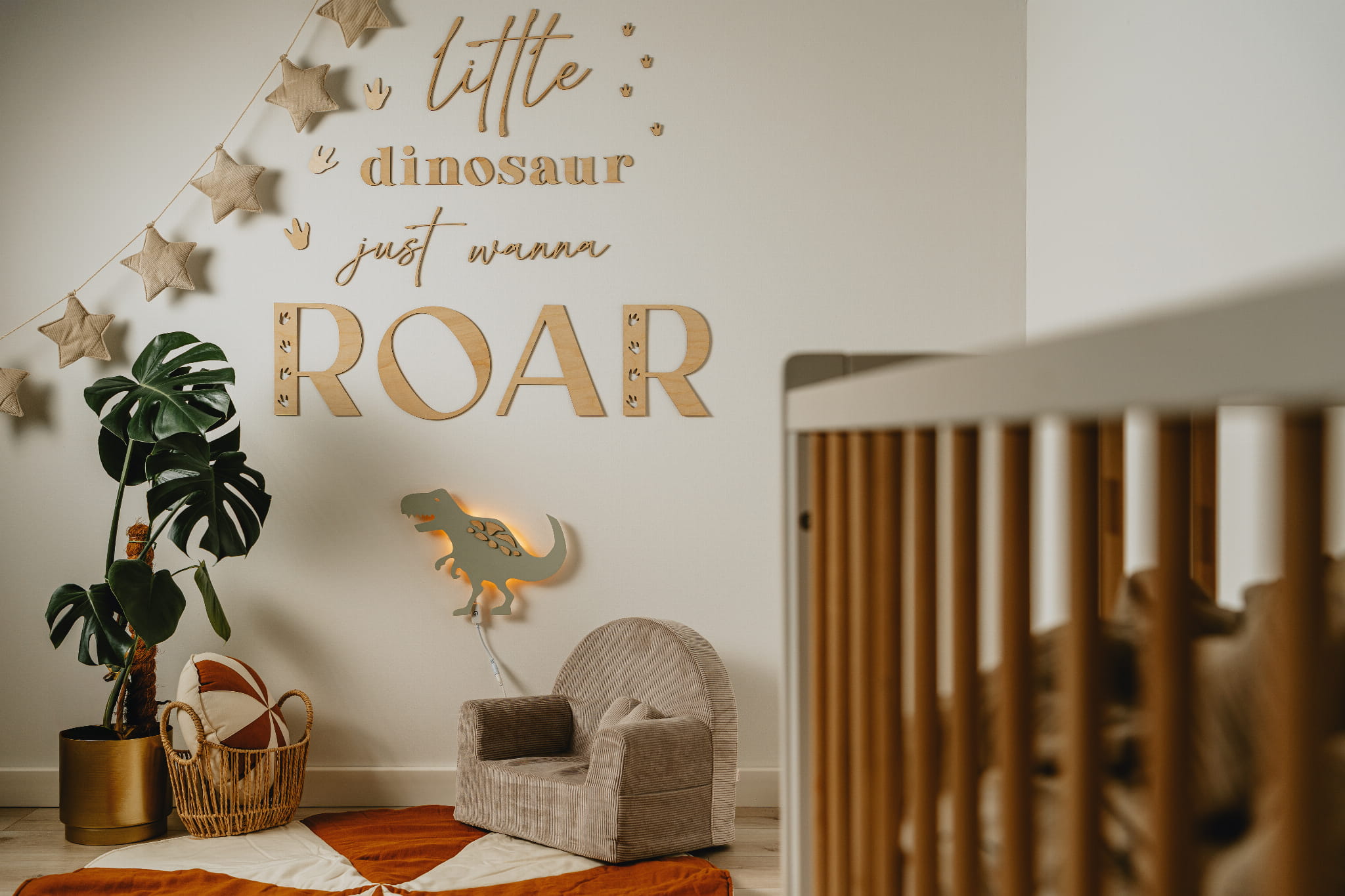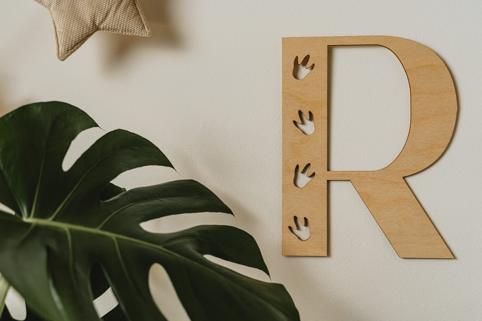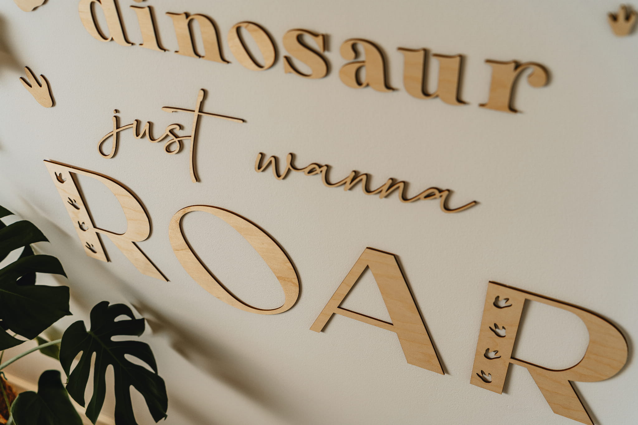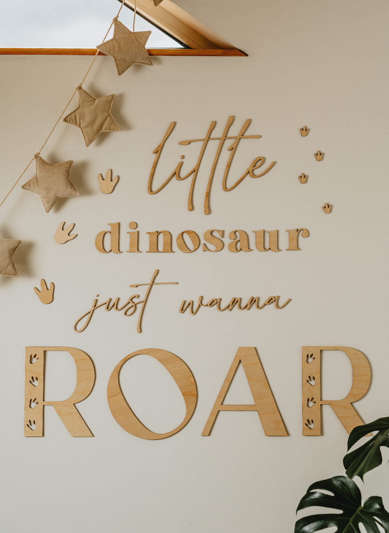 Subtiliai išpjauta iš natūralios faneros, šis rinkinys sukuria jaukią ir šiltą atmosferą – tarsi mažasis dinozauras ką tik būtų palikęs savo pėdsakus kambaryje. Rinkinyje rasite visus žodžius, dinozauro pėdeles bei lengvai nuimamos tvirtinimo masės – kad dekoravimas būtų toks pat smagus kaip ir žaidimas!