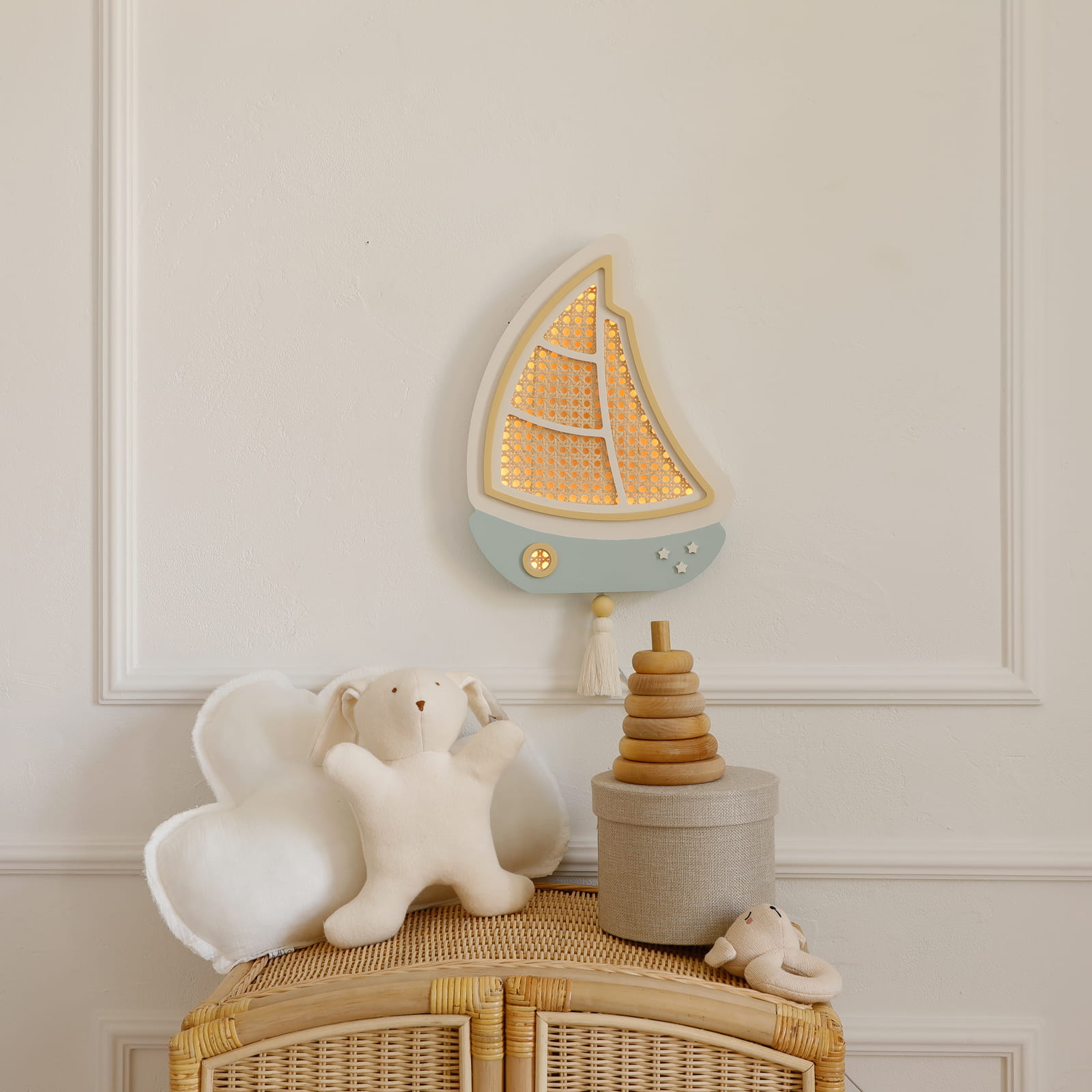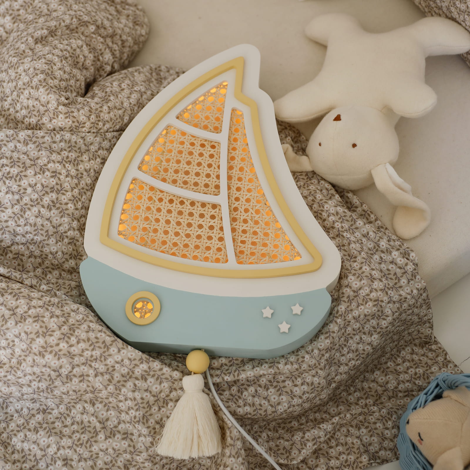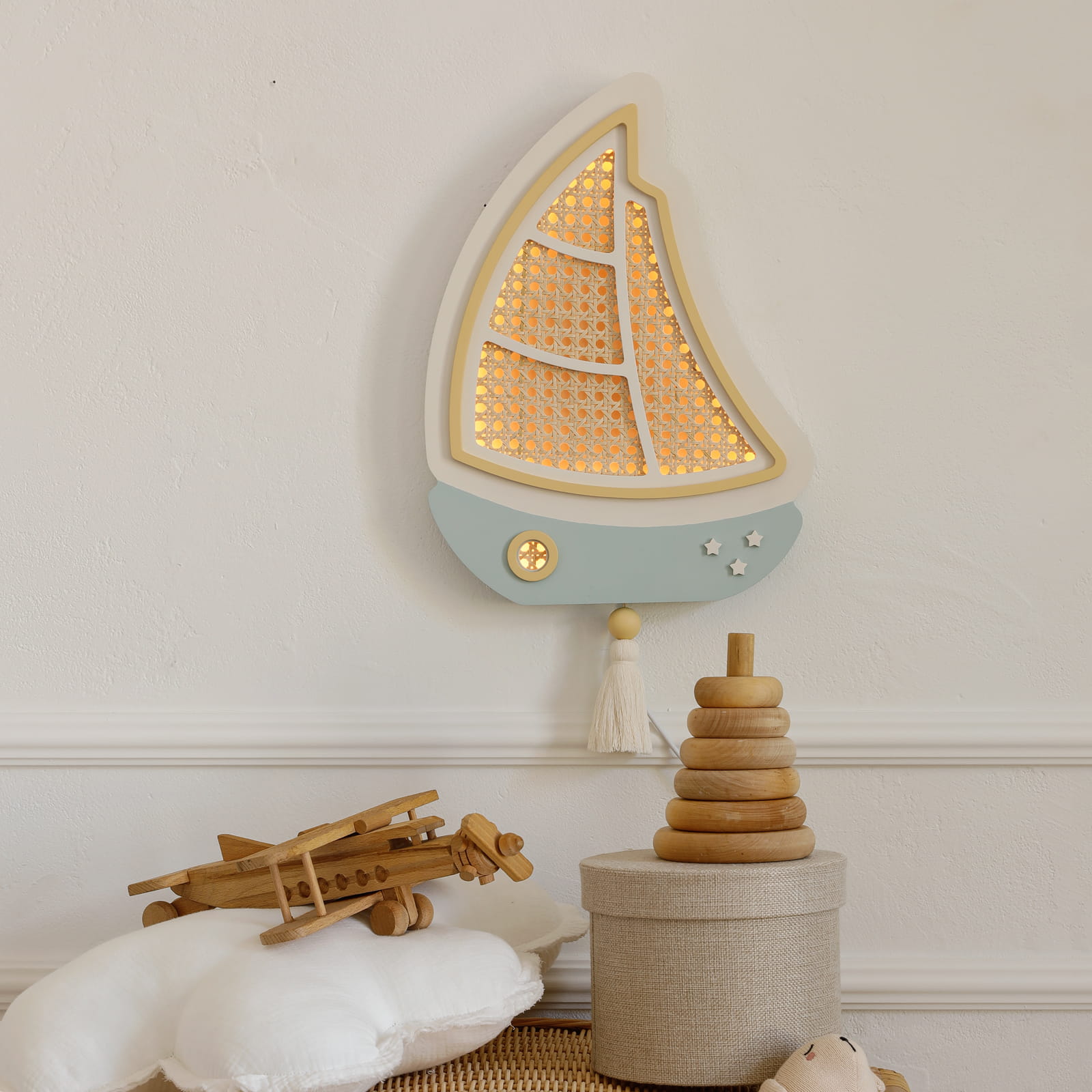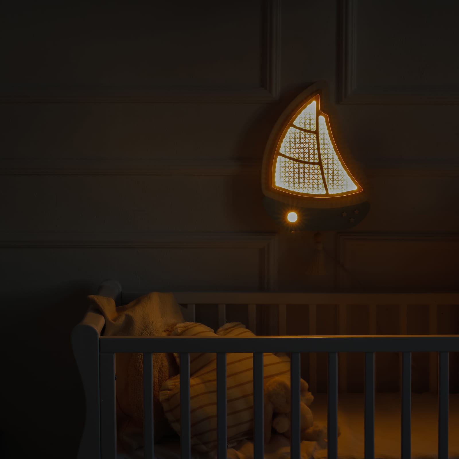 Sutemus mažas burlaivis tyliai išplaukia į ramią svajonių jūrą, lydėdamas vaikus į pasakų nuotykius. Švelni šviesa primena lopšinę ir paverčia kiekvieną vakarą ypatingu.