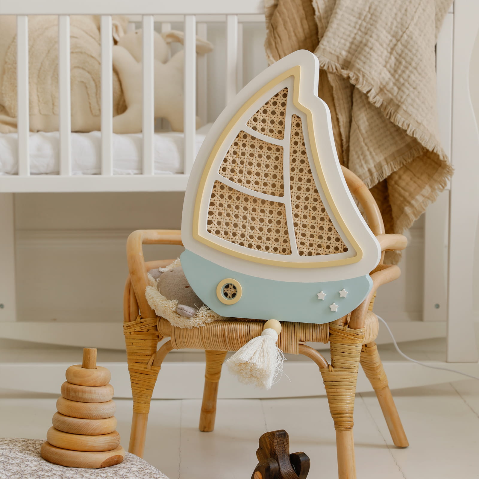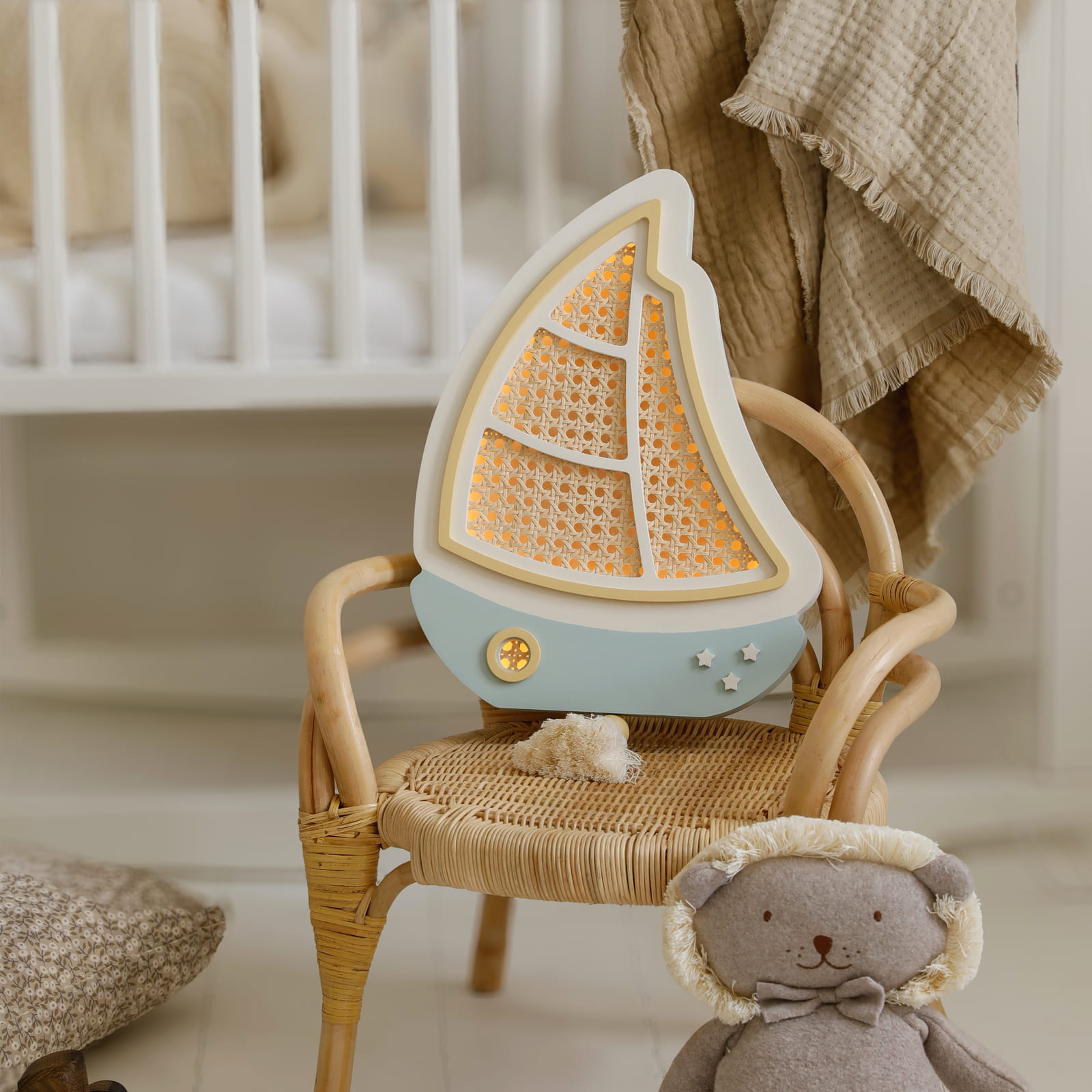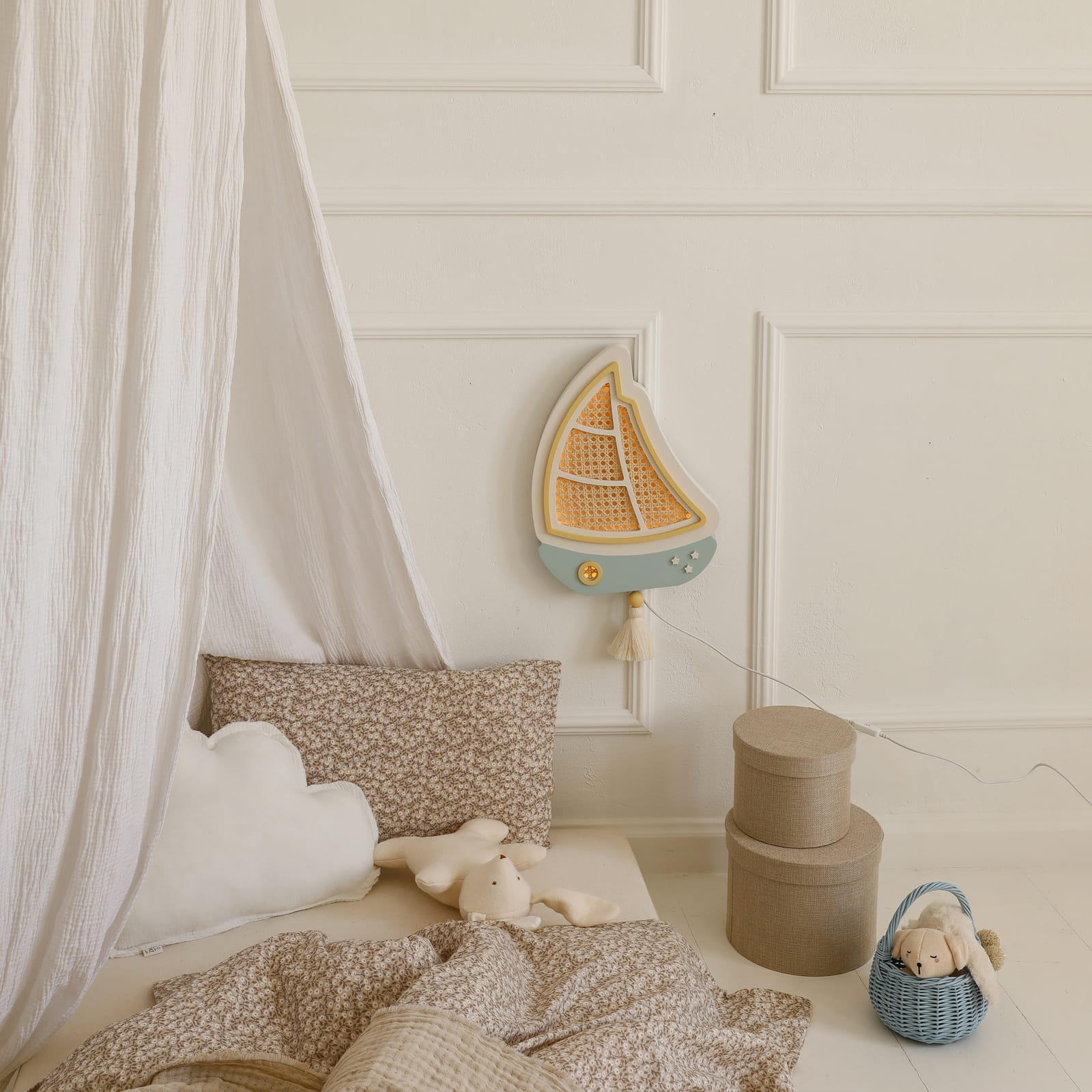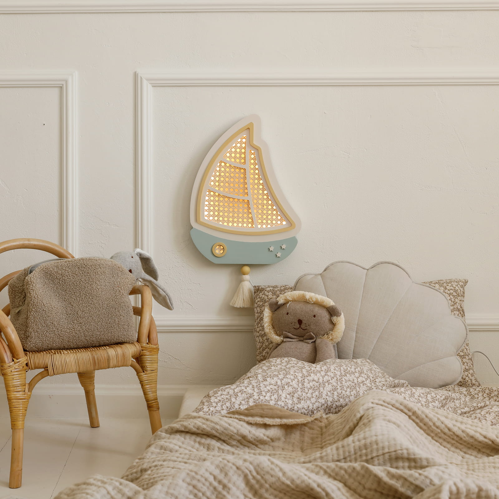 Sutemus mažas burlaivis tyliai išplaukia į ramią svajonių jūrą, lydėdamas vaikus į pasakų nuotykius. Švelni šviesa primena lopšinę ir paverčia kiekvieną vakarą ypatingu.