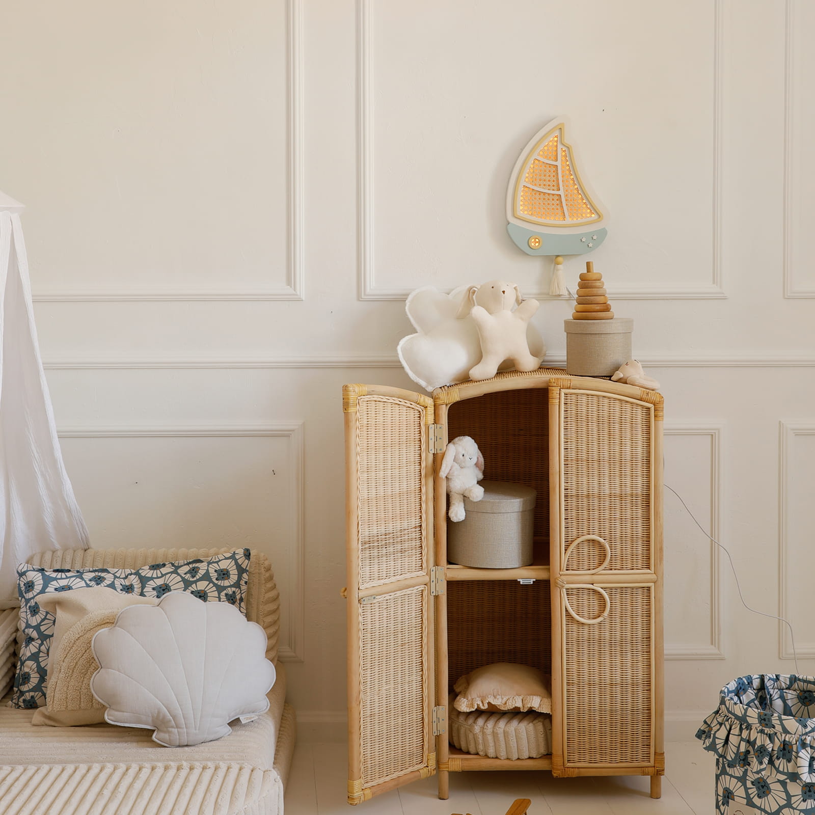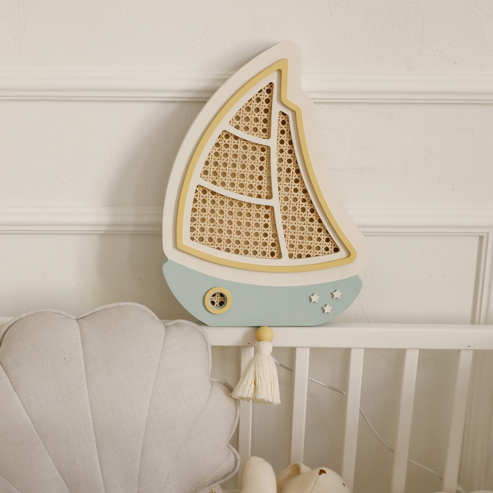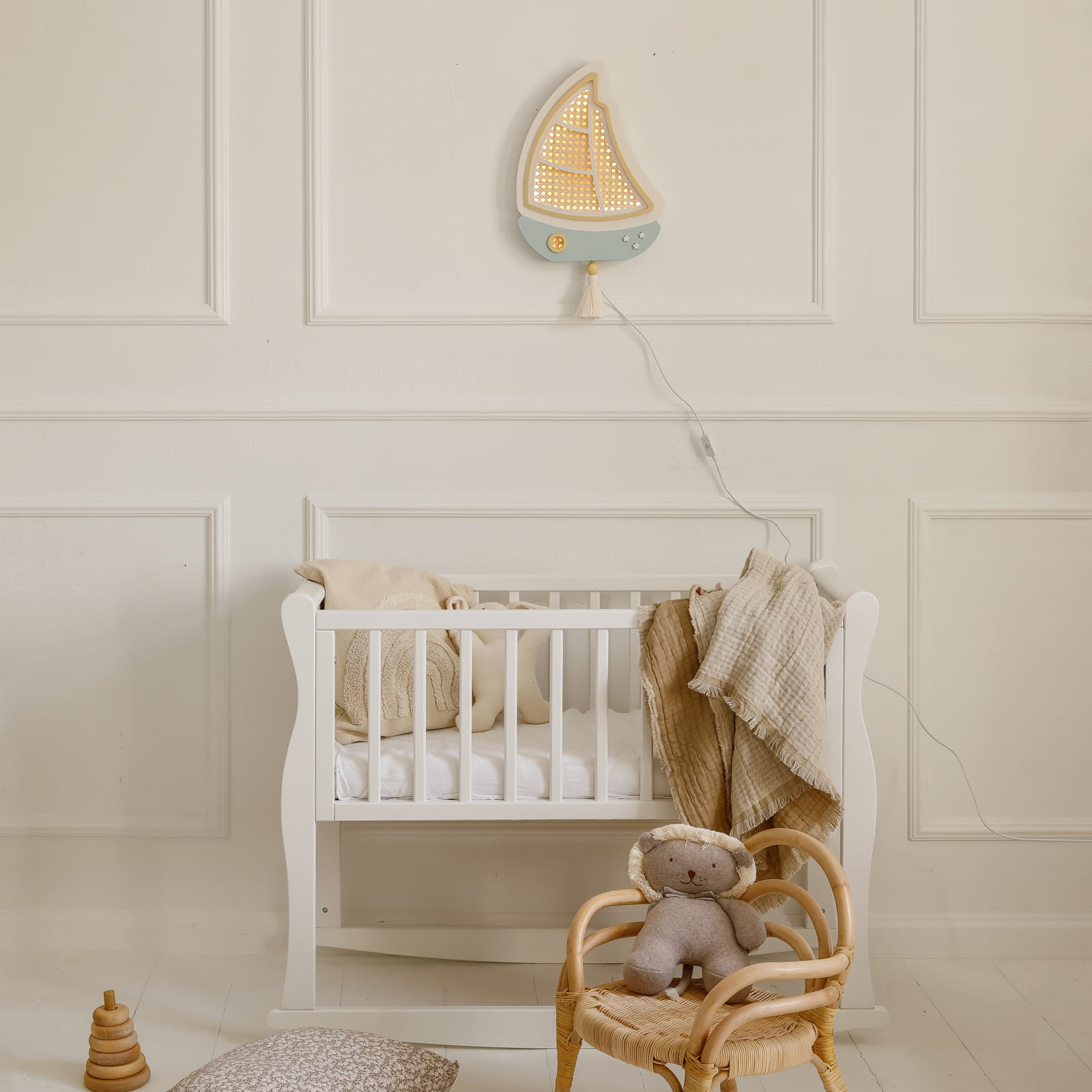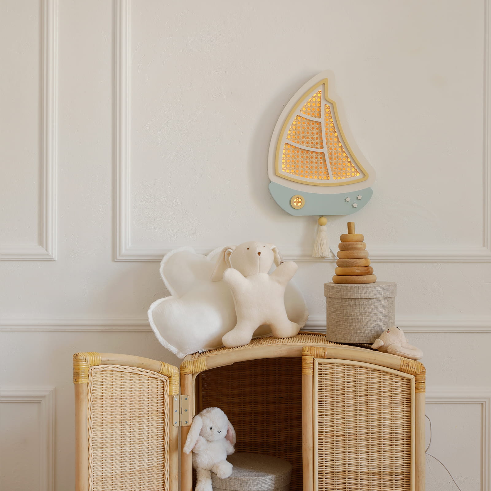 Sutemus mažas burlaivis tyliai išplaukia į ramią svajonių jūrą, lydėdamas vaikus į pasakų nuotykius. Švelni šviesa primena lopšinę ir paverčia kiekvieną vakarą ypatingu.
