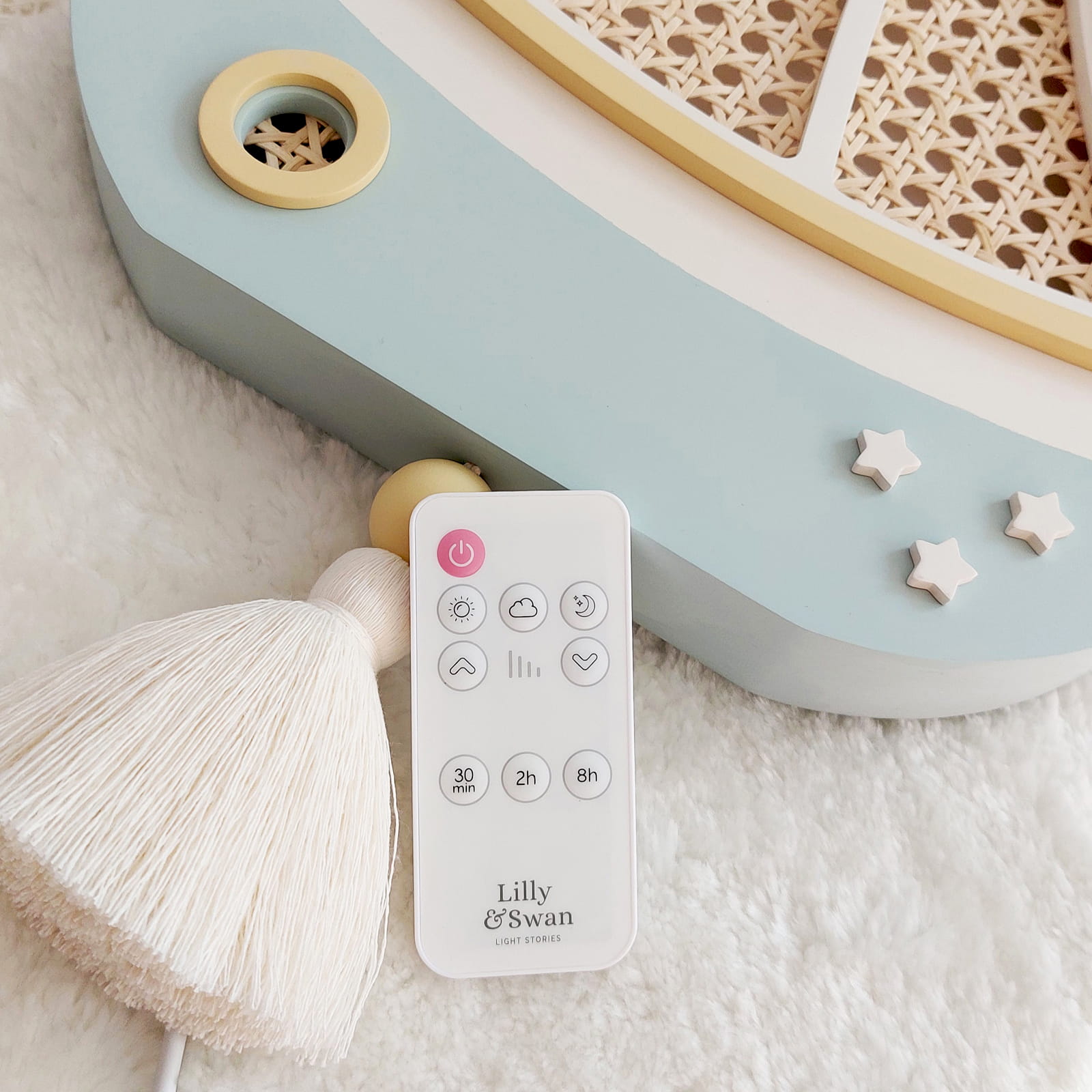 Su nuotolinio valdymo pultu galite nustatyti šviesos ryškumą ir laikmatį (30 min., 2 val. arba 8 val.) – vienu spustelėjimu.