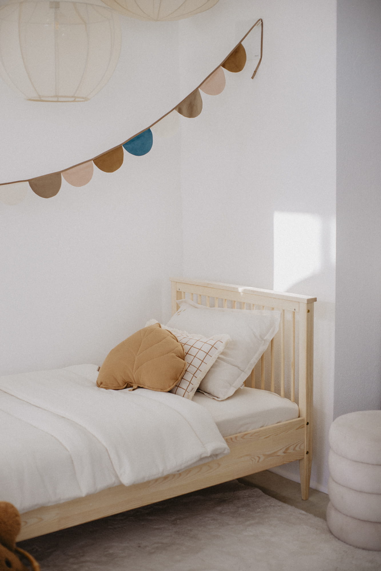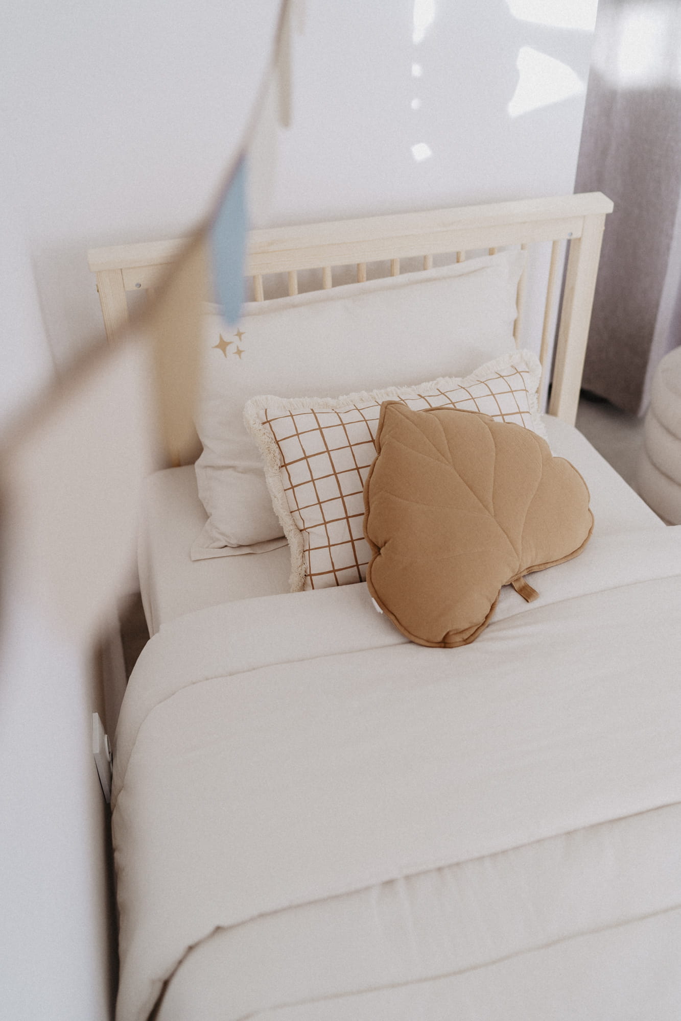 Ši dekoratyvinė lapo formos pagalvėlė – ne tik žaisminga vaiko kambario puošmena, bet ir jaukus kasdienybės palydovas. Sukurta iš itin minkštos, skalbtos medvilnės, ji džiugina savo tekstūra, natūralumu ir švelnumu.