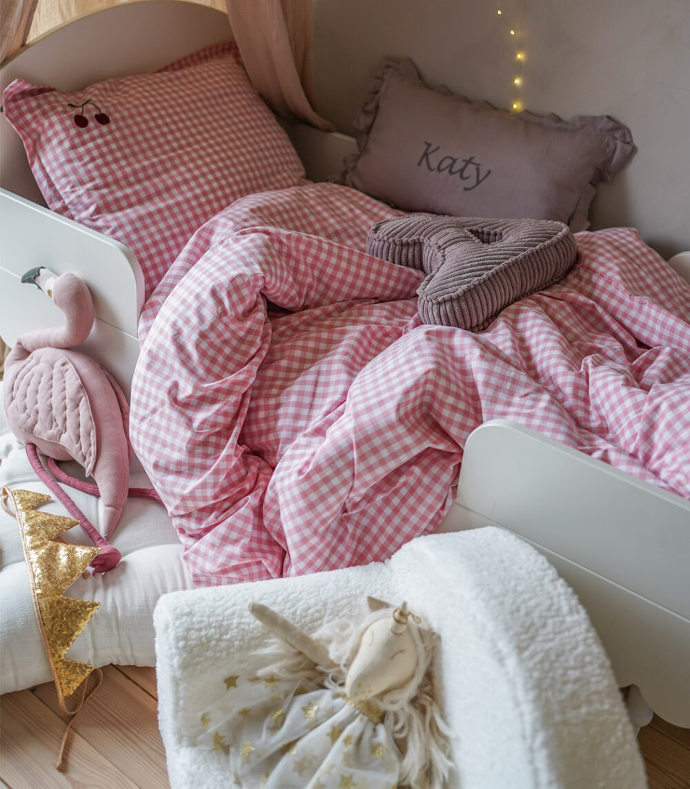 Languoto rašto medvilnės užvalkalų komplektas su vyšnių aplikacija – jaukiam ir žaismingam vaikų kambariui.