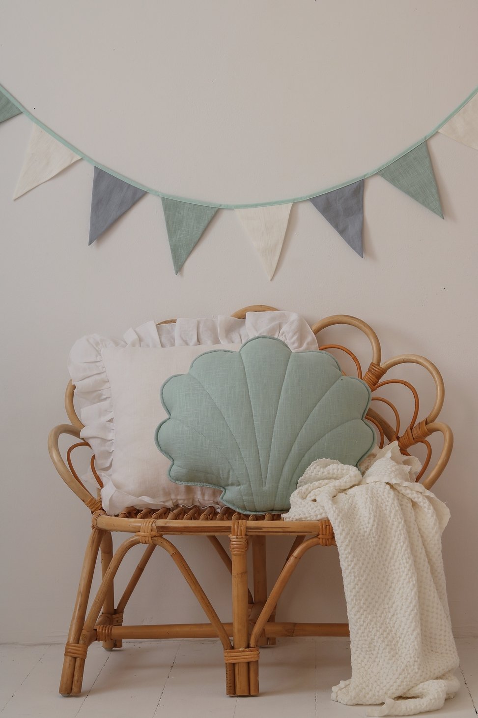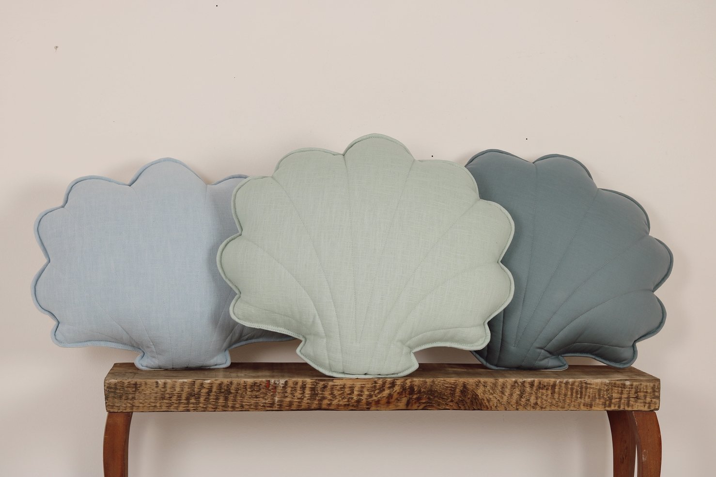 Ši kriauklės formos pagalvė pasiūta iš aukštos kokybės dykumos smėlio spalvos lino. Užpildyta hipoalerginėmis silikoninėmis granulėmis, kurios išlieka purios ir elastingos net po daugybės skalbimų.