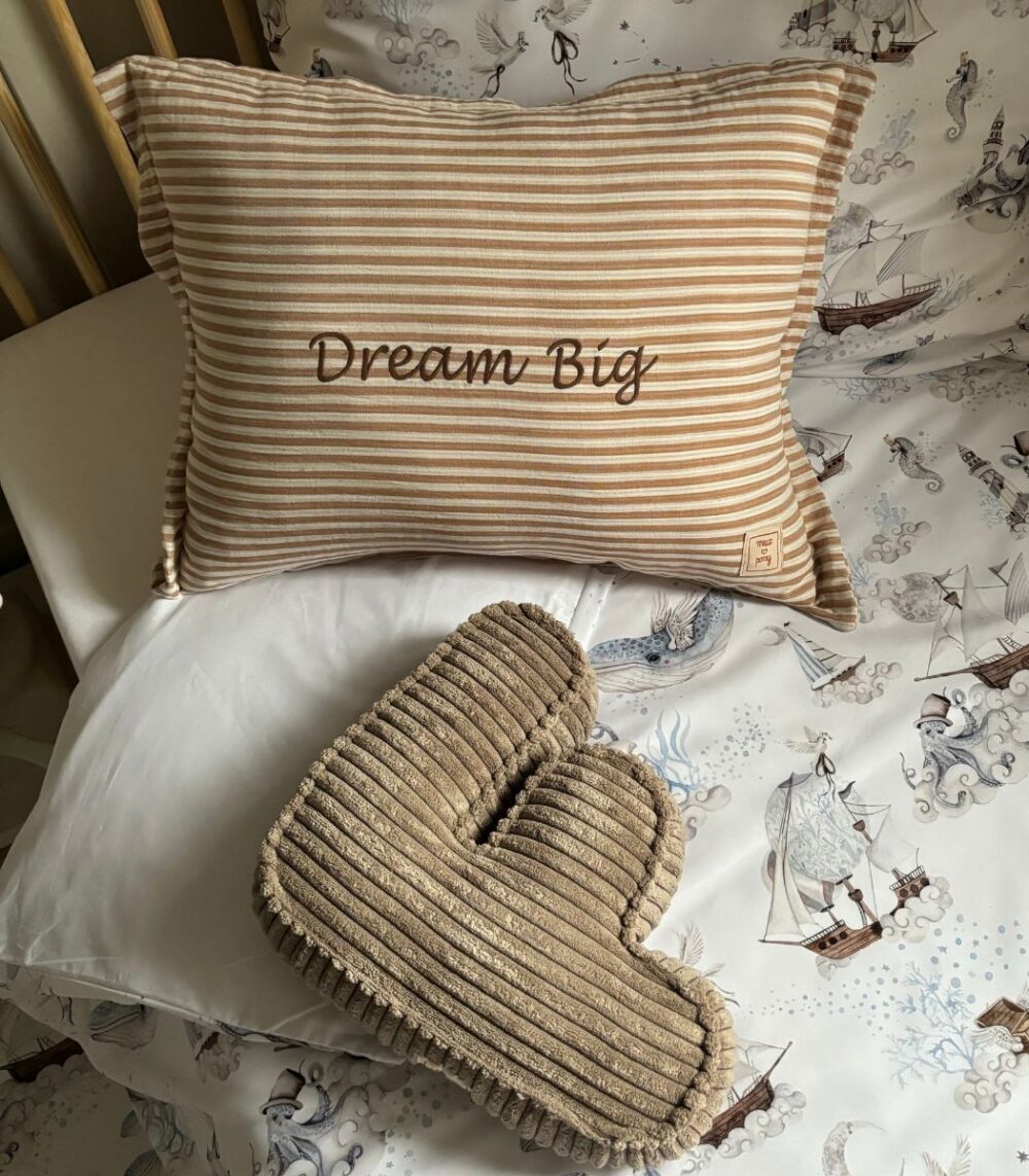 Suasmeninkite mažylio kampelį dekoratyvine pagalvėle, kuri džiugins tiek kaip kambario akcentas, tiek kaip miela dovana. Kiekviena pagalvėlė siuvama individualiai – pasirinkite norimą raidę ir paverskite ją šilta interjero detale.