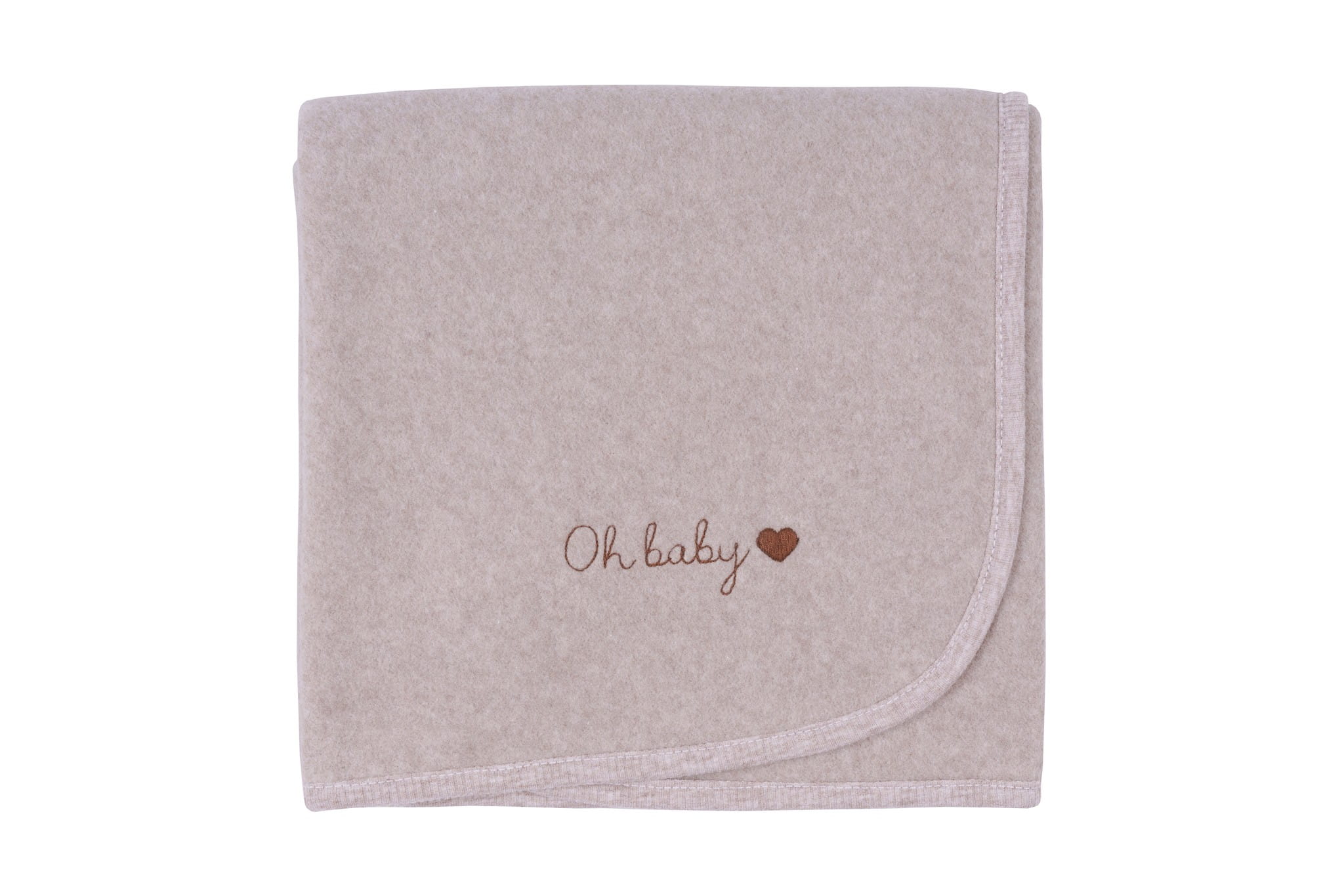 Itin minkšta antklodė iš sertifikuotos GOTS ekologiškos medvilnės (75 × 90 cm) švelniai apgaubia kūdikį, suteikdama šilumos ir jaukumo. Paviršius – su subtiliu pūkeliu, kraštai dekoruoti stilinga juostele, o siuvinėtas užrašas oh baby suteikia žaismingo švelnumo.