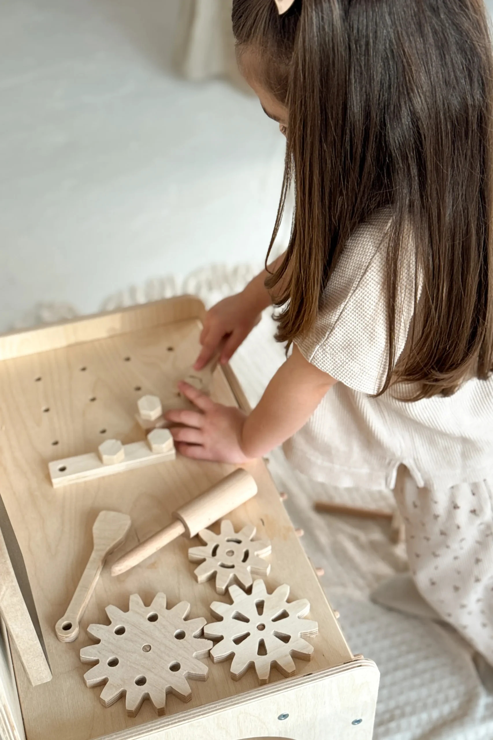 🔧 Tvirtinti, atsukti, pjauti – viskas pritaikyta smulkioms rankutėms. Žaidimas su įrankiais moko atsakomybės, tikslumo ir kantrybės.