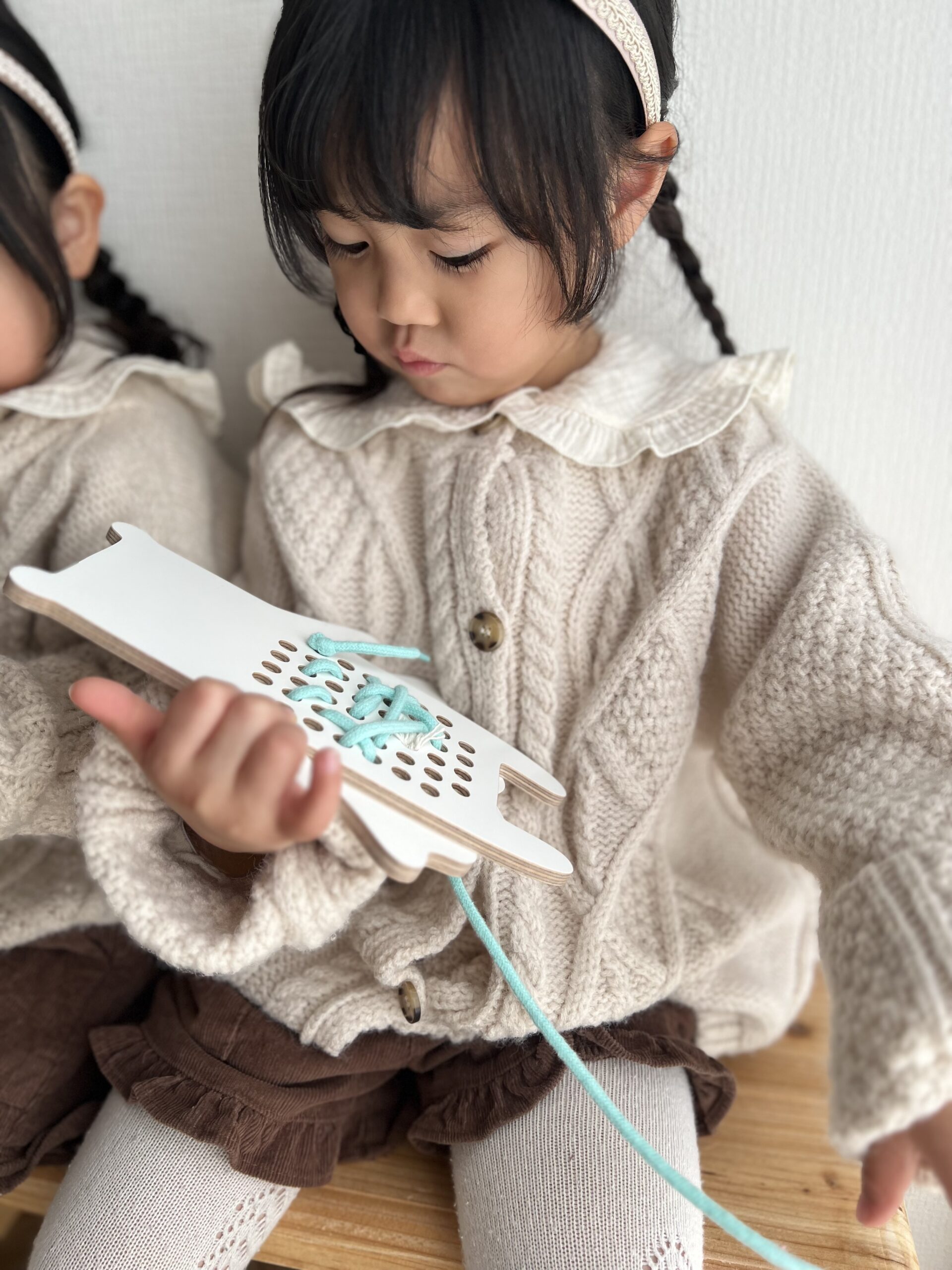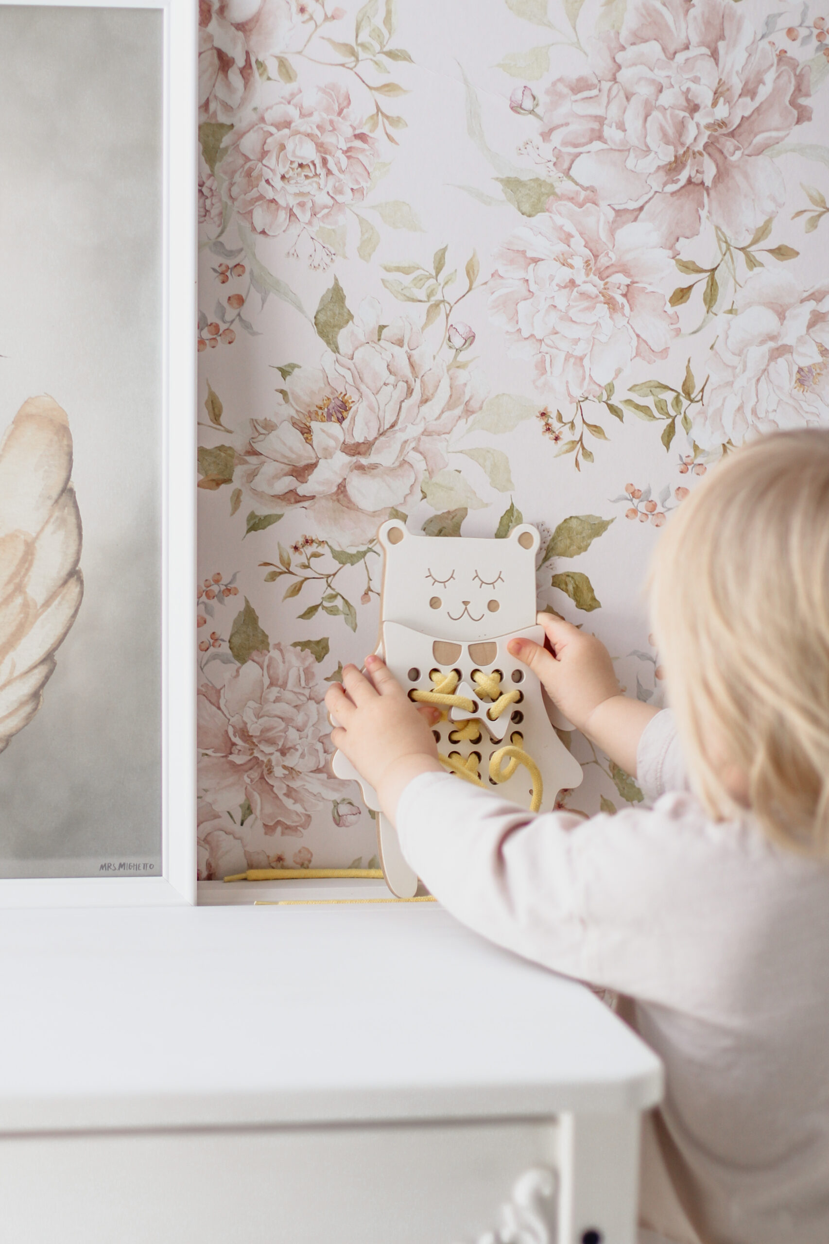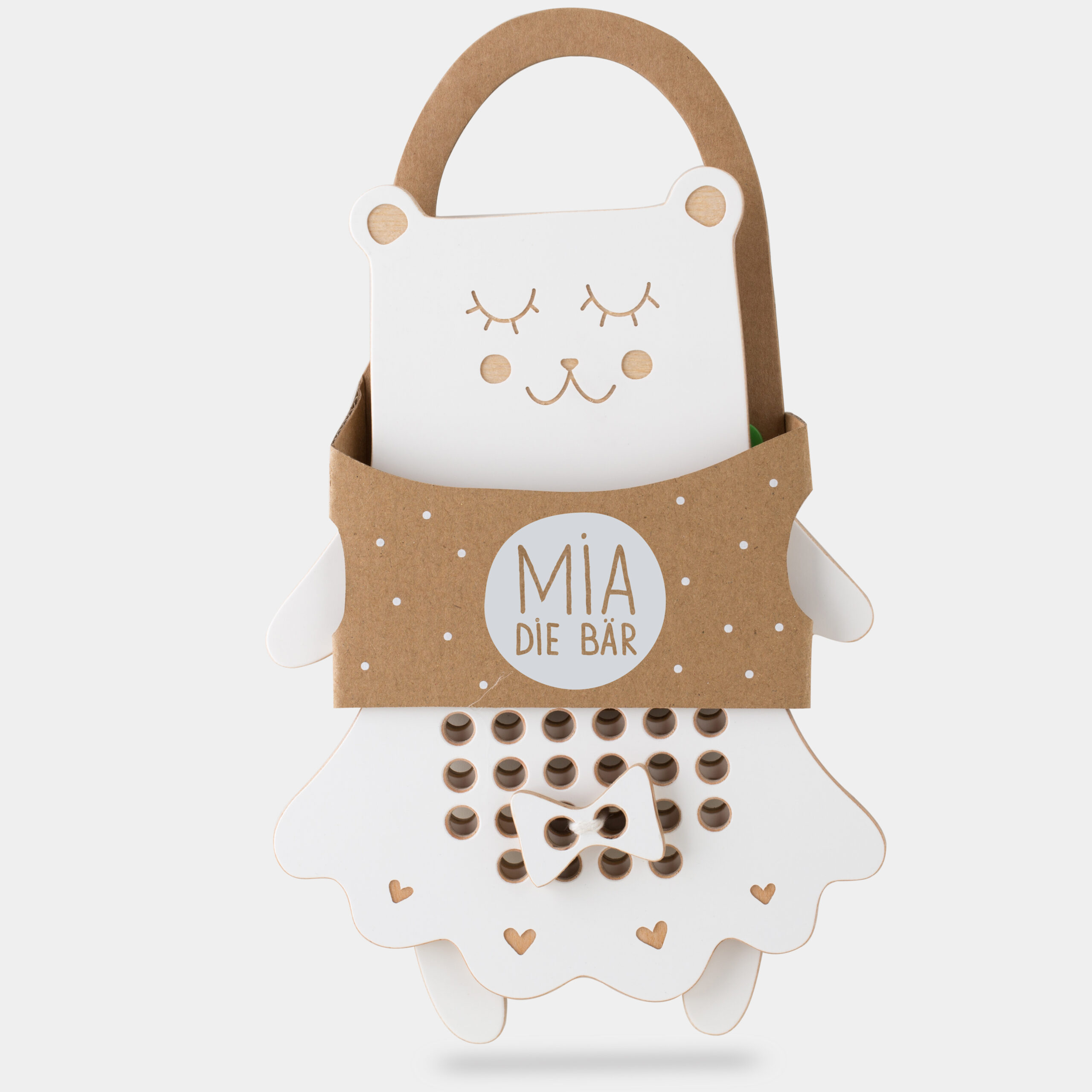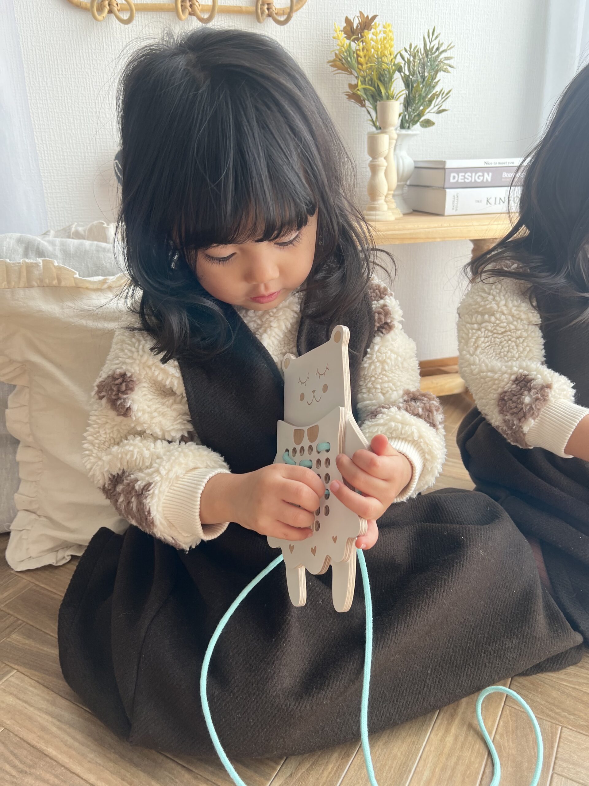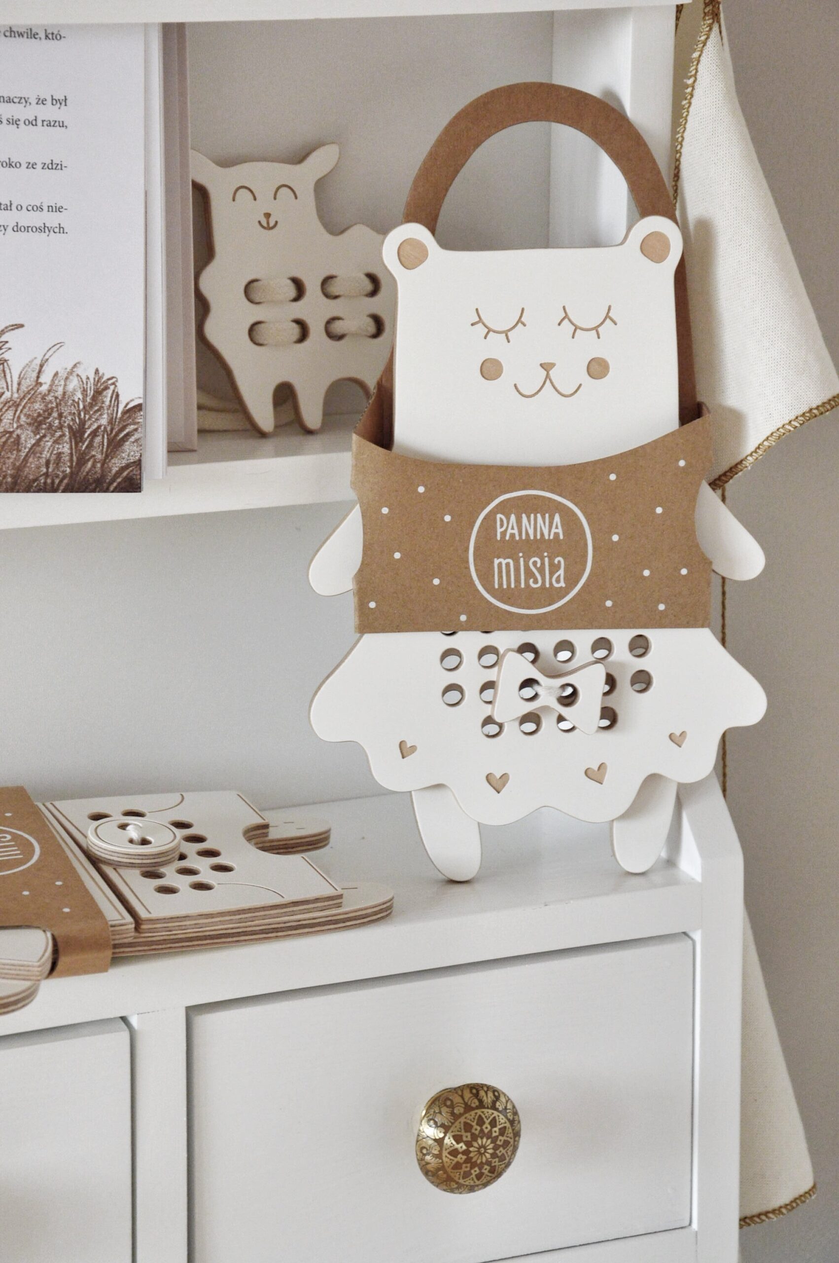 Švelni ir miela panelė meškutė – tai Montessori dvasia sukurtas vėrimo žaislas, kuris lavina vaikų smulkiąją motoriką, kūrybiškumą ir vaizduotę. Veriant raištelį per meškutės formą, vaikai mokosi susikaupti, koordinuoti judesius ir pažinti spalvas bei gyvūnus.