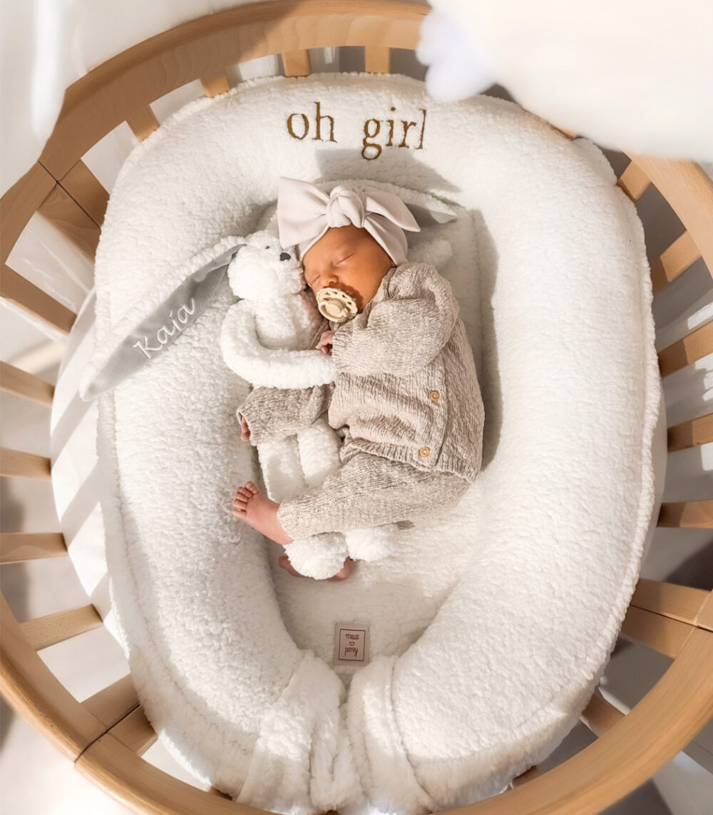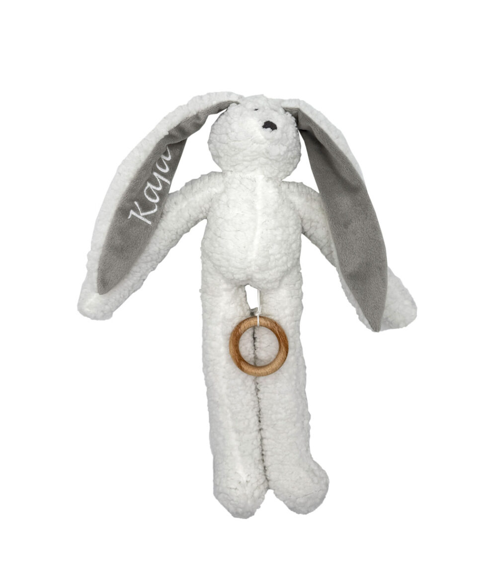 Minkštas, personalizuotas draugas pirmosioms akimirkoms. Groja melodiją traukiant medinį žiedą, o ant ausytės gali būti išsiuvinėtas vardas.
