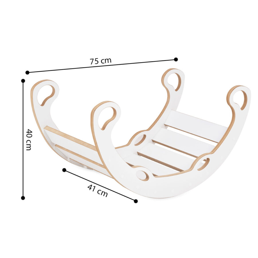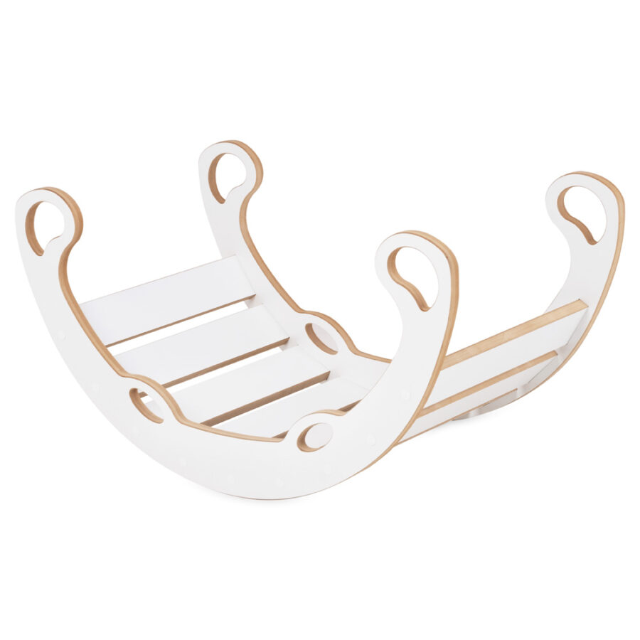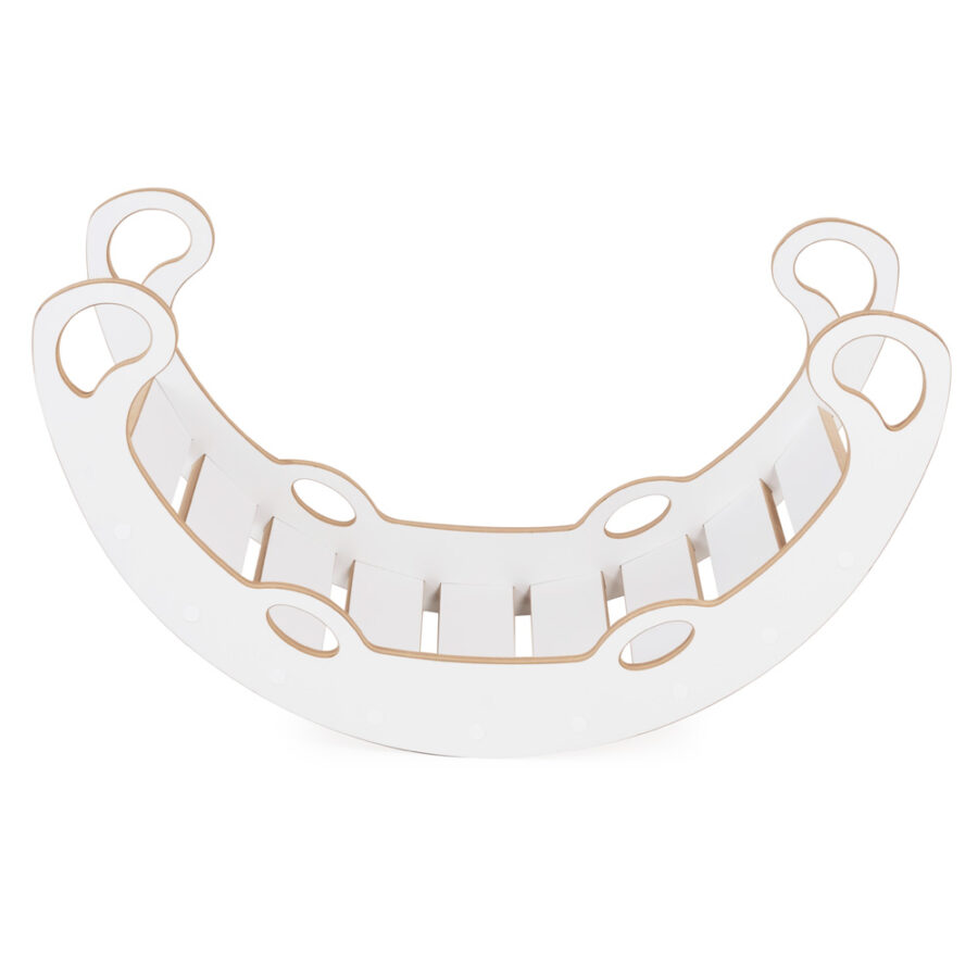 Supynė pagaminta iš aukštos kokybės MDF – tvirtos, lygios ir vaikams saugios medžiagos. Visi kraštai kruopščiai užapvalinti ir nušlifuoti, o komplekte esantis minkštas, patogus čiužinukas paverčia supimą tikru malonumu. Apvertus supynę aukštyn kojomis, ji tampa stabilia laipynės konstrukcija – puikiu iššūkiu mažiesiems tyrinėtojams ir ropotojams. Tokia veikla skatina savarankišką žaidimą ir fizinį aktyvumą.