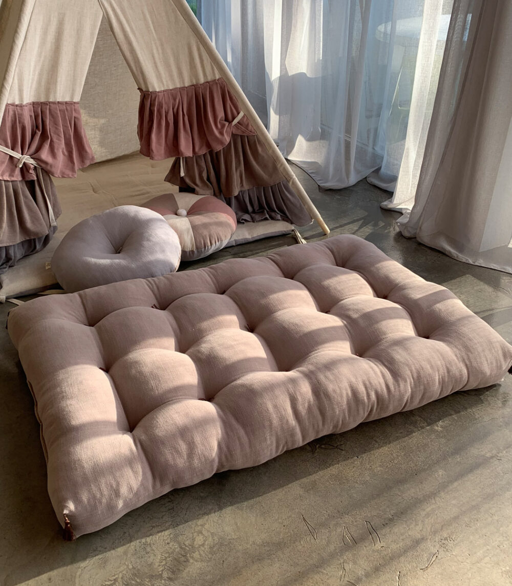 Rankomis dygsniuotas čiužinukas – švelni ir stilinga poilsio bei žaidimų erdvė vaikui. Pilkšvai rudos spalvos audinys, natūrali lino ir viskozės sudėtis, o kutai suteikia subtilios estetikos.